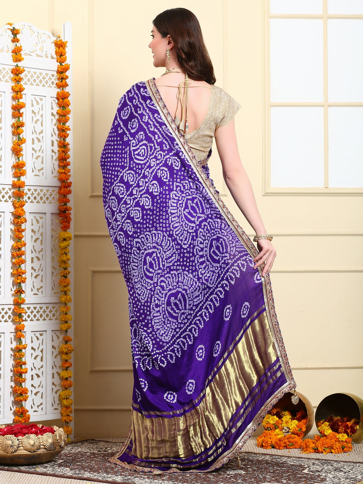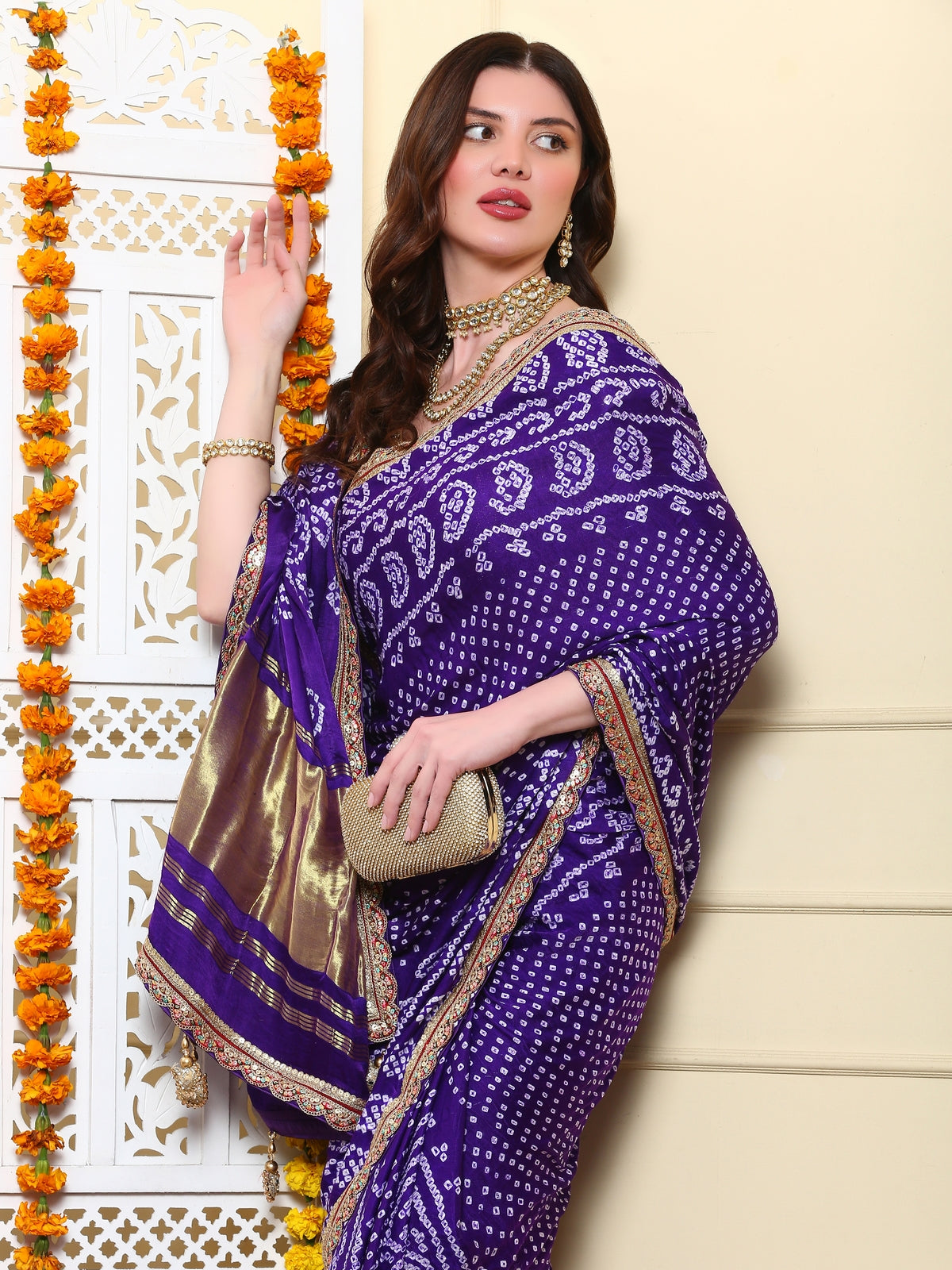 The tradition of Gujrat in the form of tie & dye is showcased in this stunning and rich Bandhini Saree...The unique art of bandhini highlighted with meena work border and Lagdi Pallu is skillfully displayed in this exclusive and classy Saree..