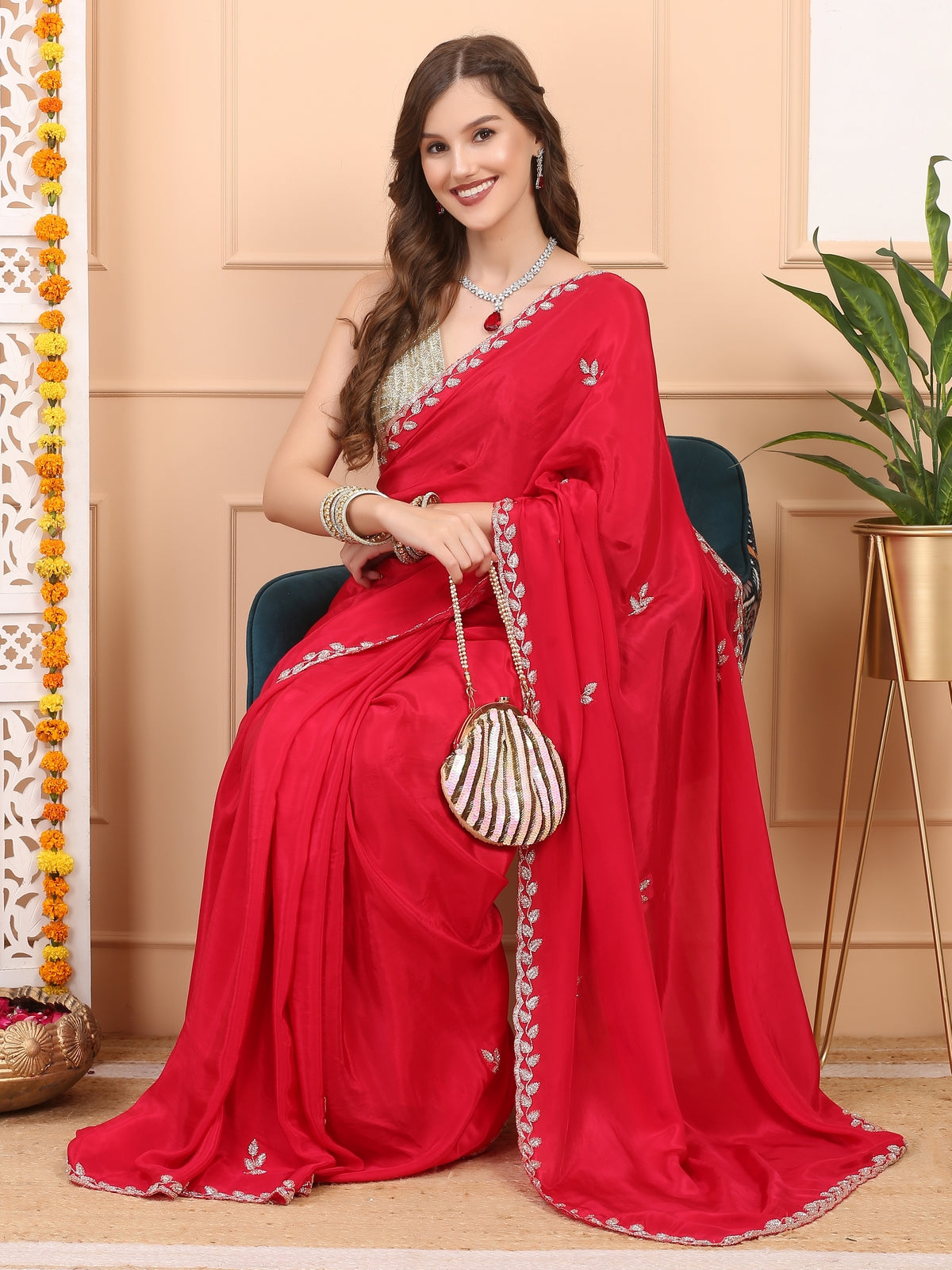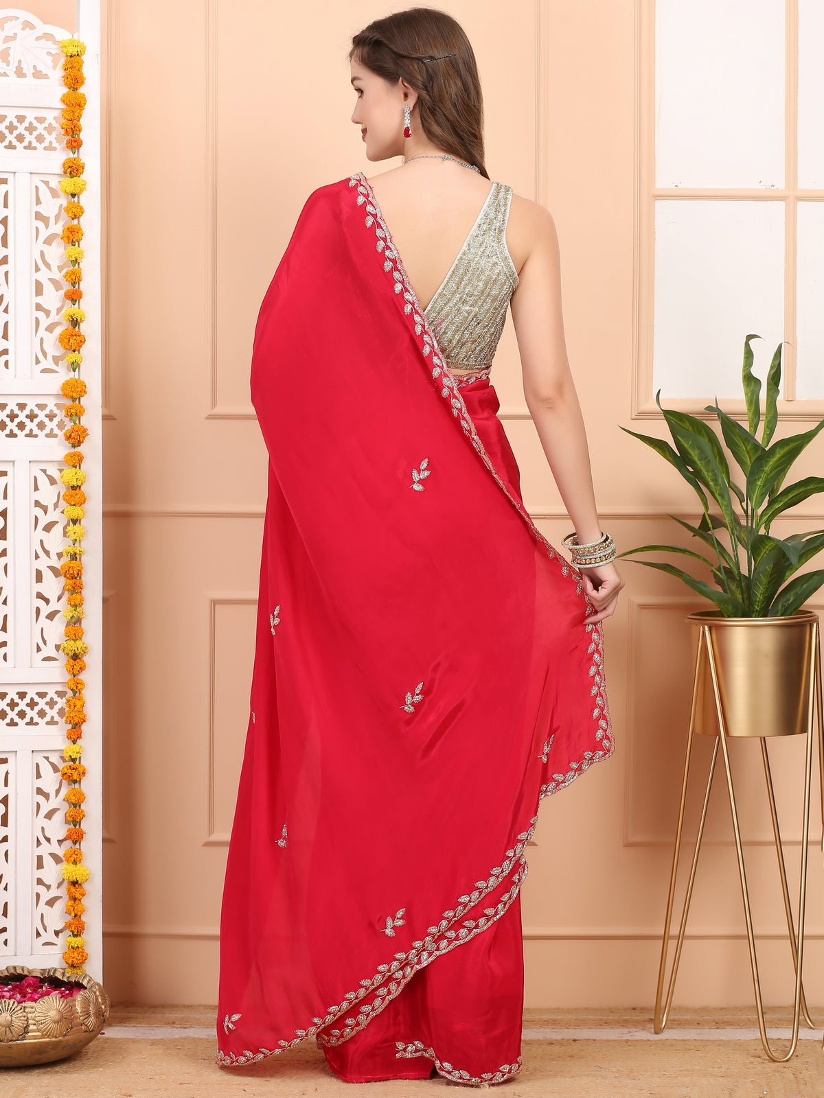 Ruby Red Satin Saree