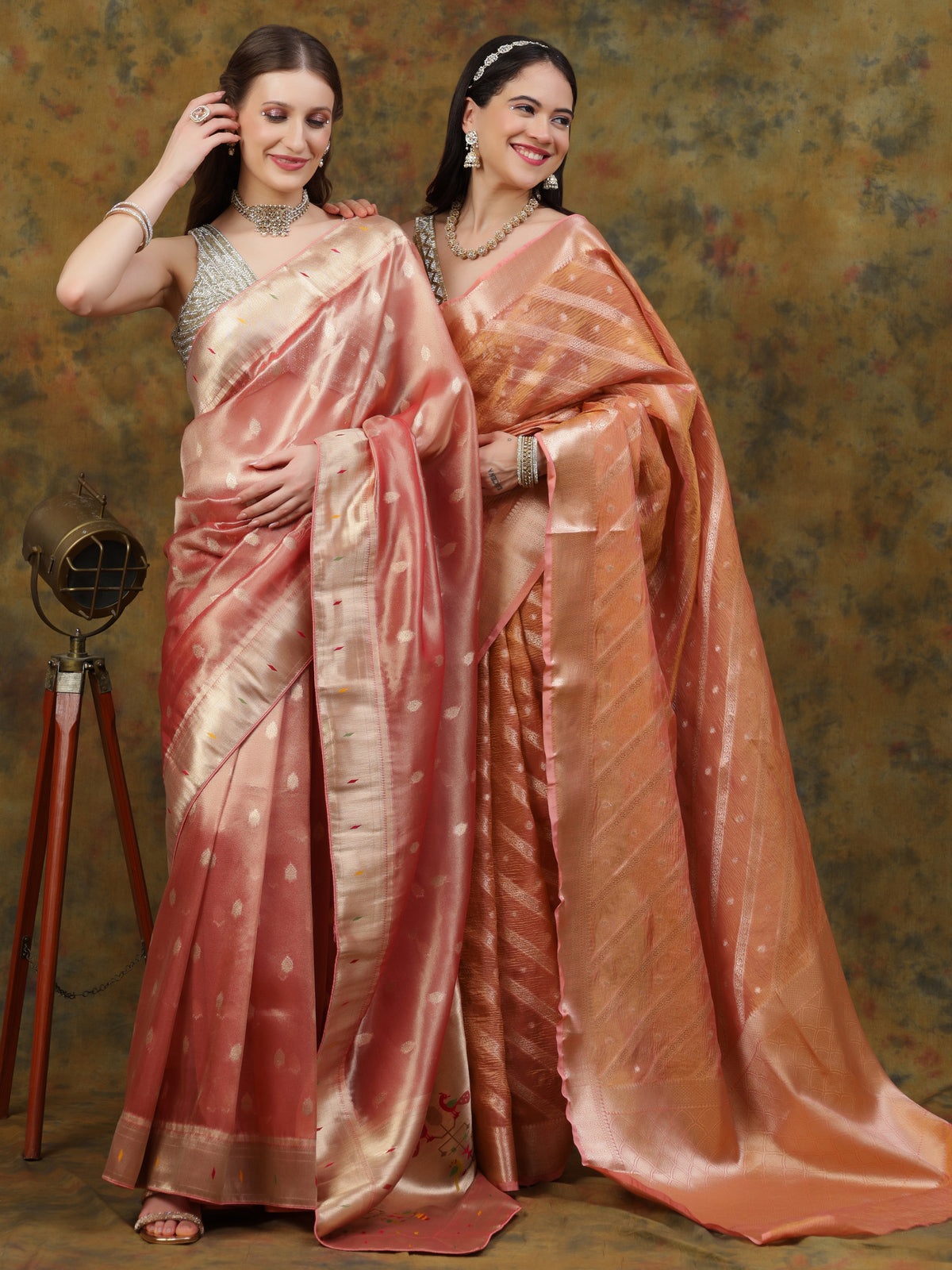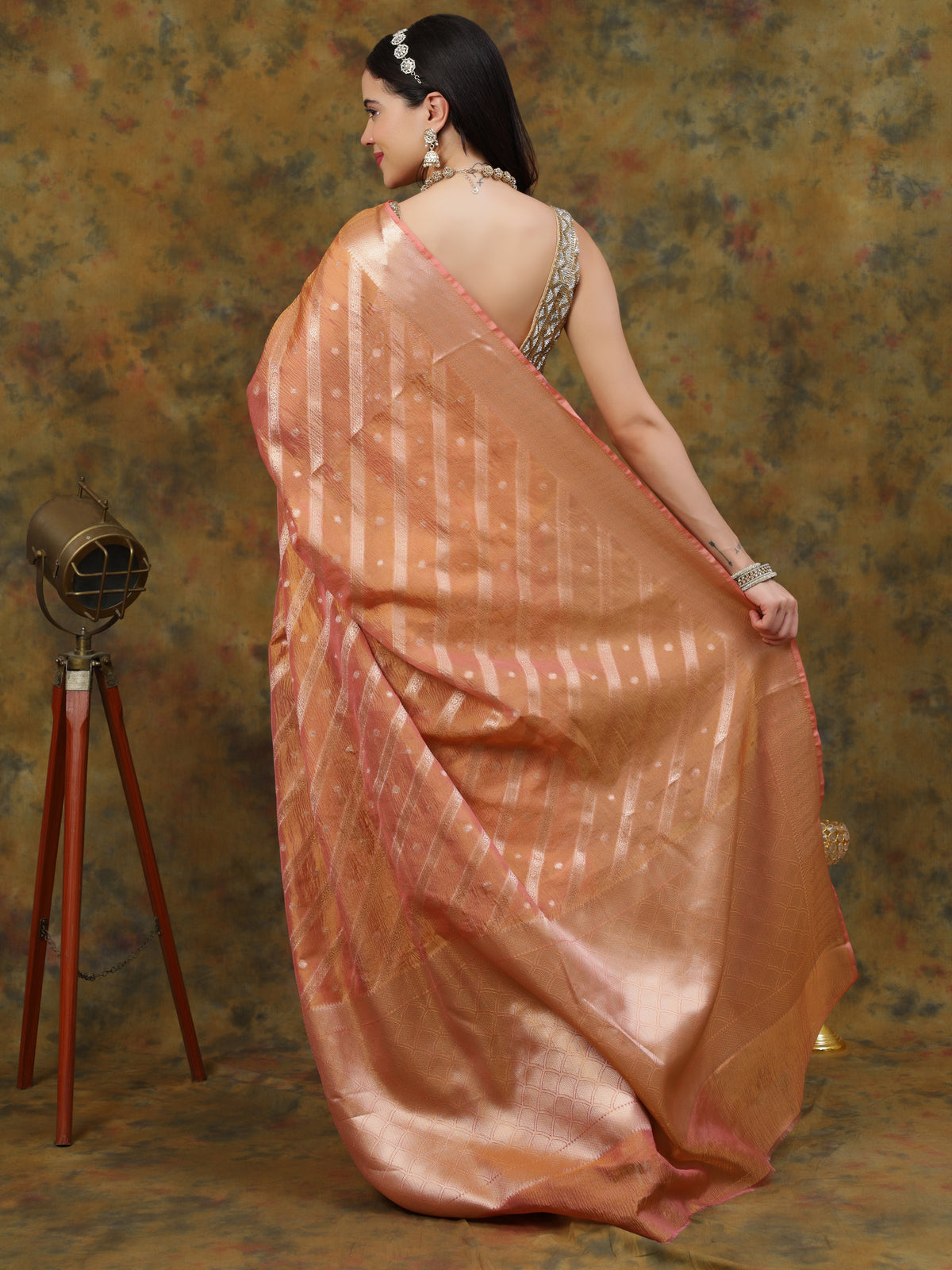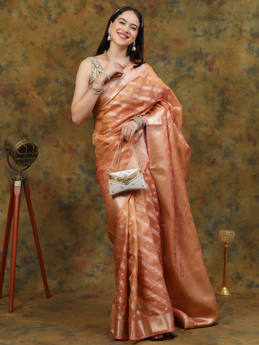 Exquisite Crush Tissue Saree interwoven in Zari Leheriya pattern gives it a festive and modern look..Delicate weaving and skilled craftsmanship showcases the brilliance of our artisans..A must have in your collection..