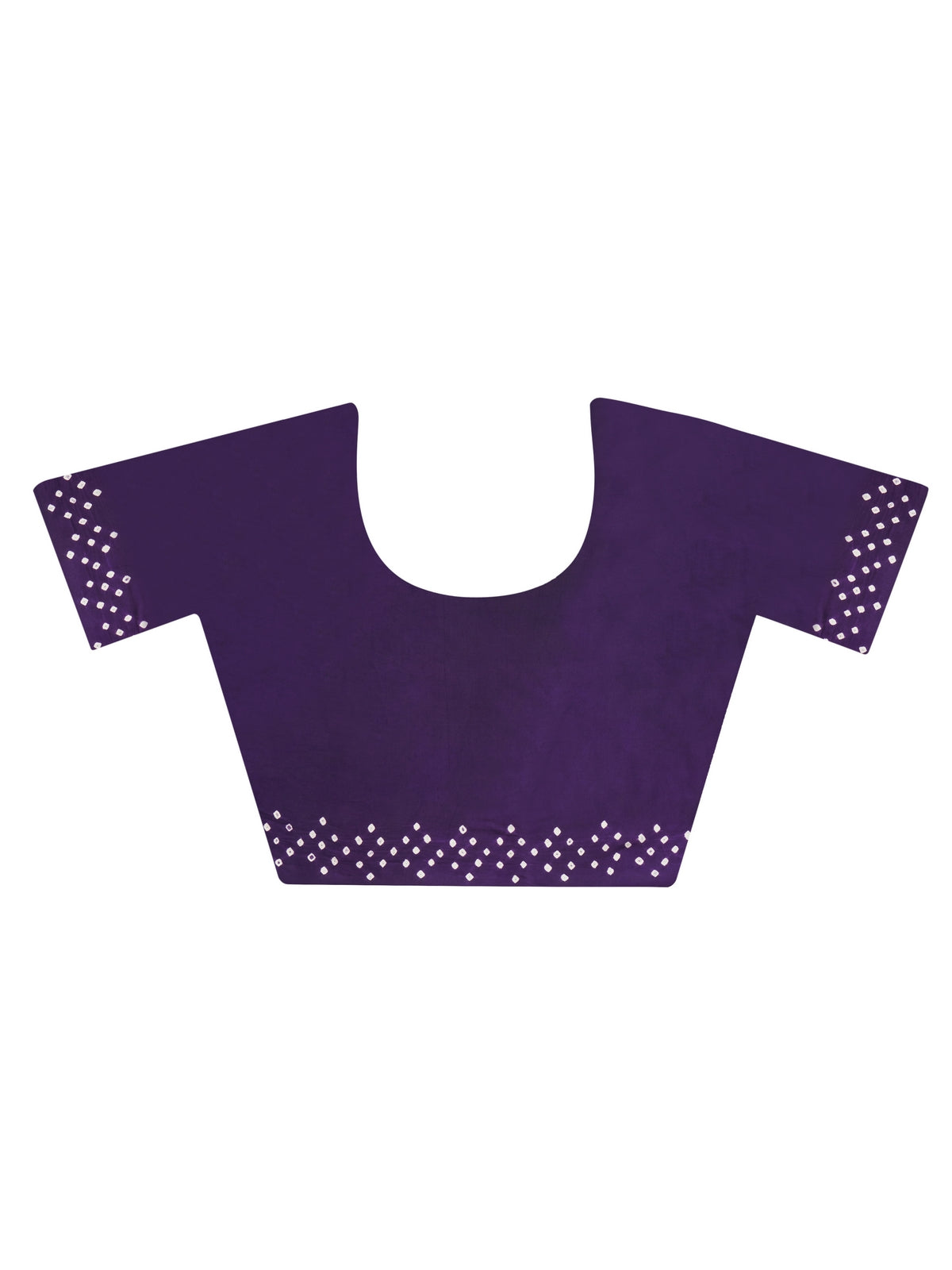 Stunning Purple Bandhej Saree with intricate white Tye & Dye pattern gives it a festive yet modern look..Traditional bandhini weaving displayed by our skilled artisans showcases our rich textile heritage.. It is further enhanced by the unique zari Lagdi Pallu and running blouse piece..