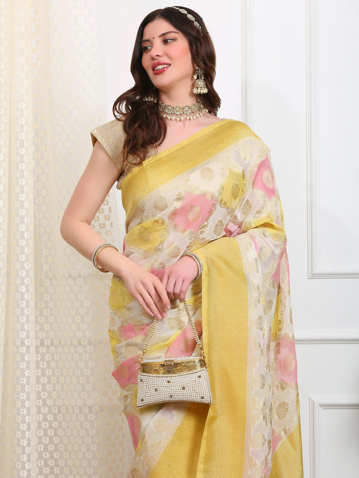 This Georgette Rangkaat two toned Saree with border and Pallu are skillfully woven to create a luxurious look.. These are timeless treasures woven in pastel colours and display the mastery and skill of our weavers..