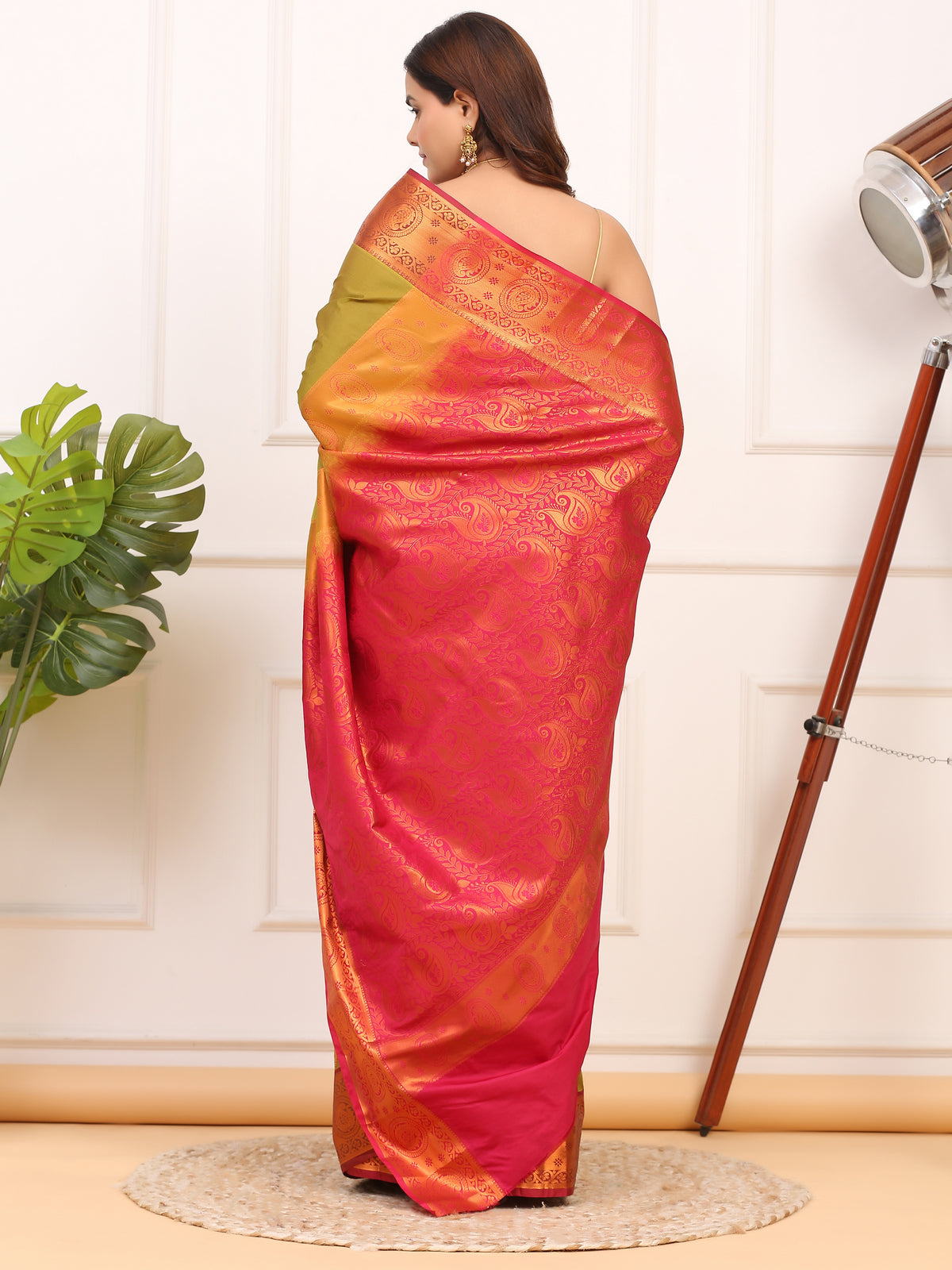 A stunning Mehndi Green Kanjivaram saree adorned with intricate copper zari paisleys. Finished with a bold contrast red border and rich pallu for timeless elegance.