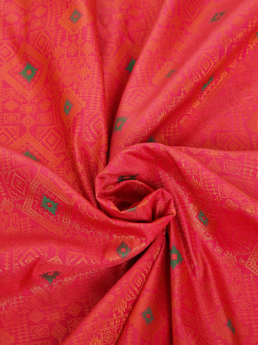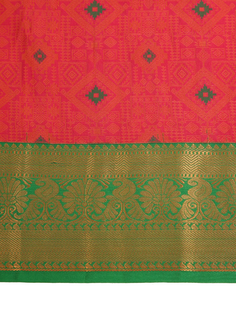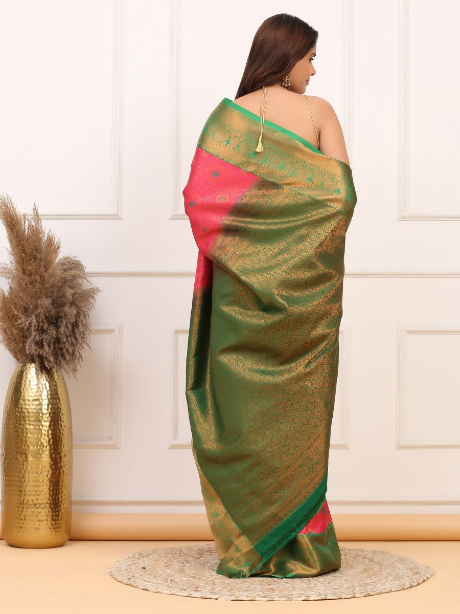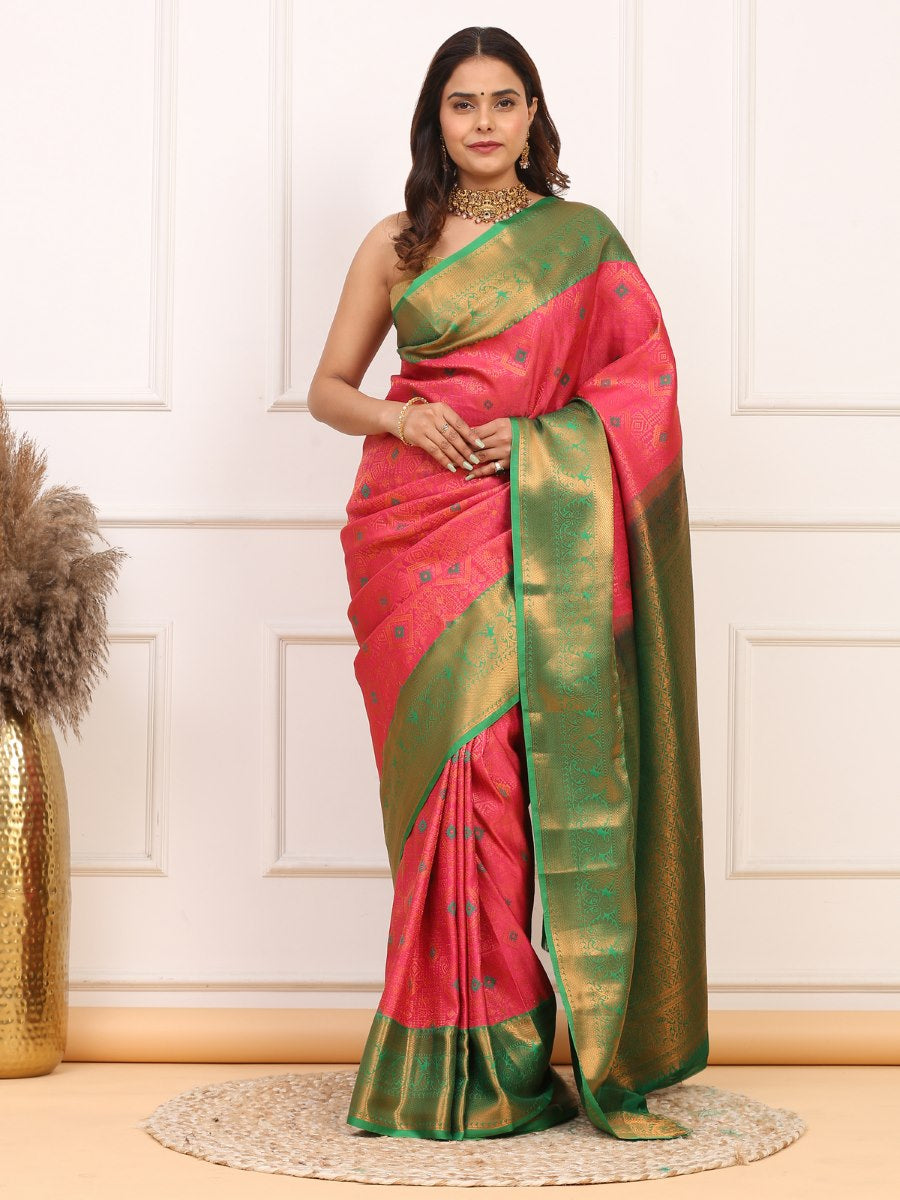 Stunning Pink Kanjivaram silk saree with butti allover and contrast green zari border & Pallu..