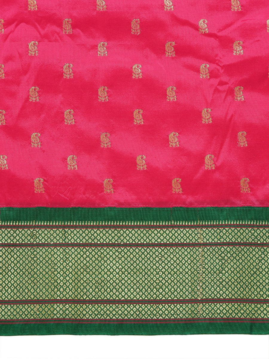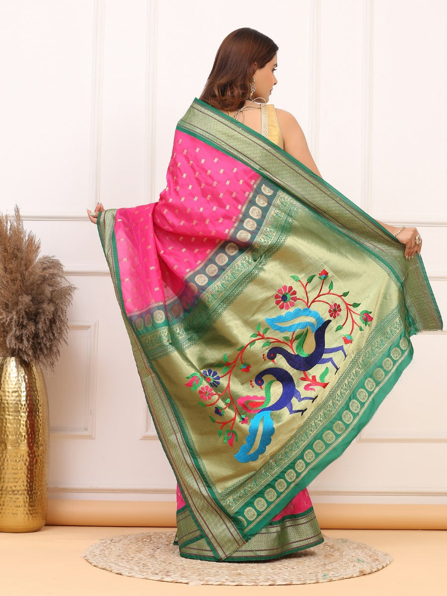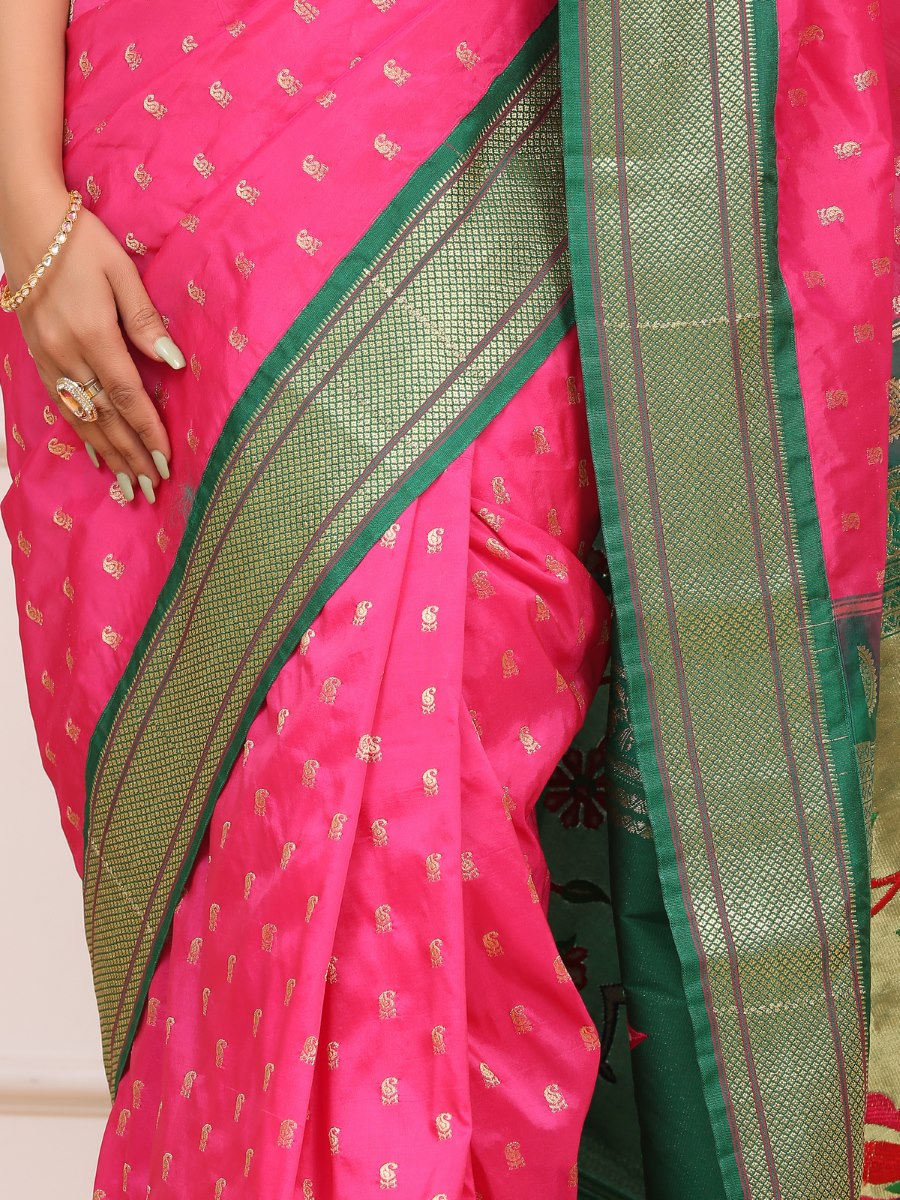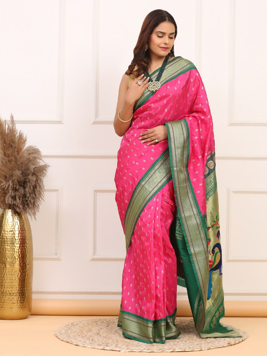 Gorgeous Pink Paithani blended silk saree with beautifully woven peacock pallu..small butti and contrast green border add to the elegance of the saree..