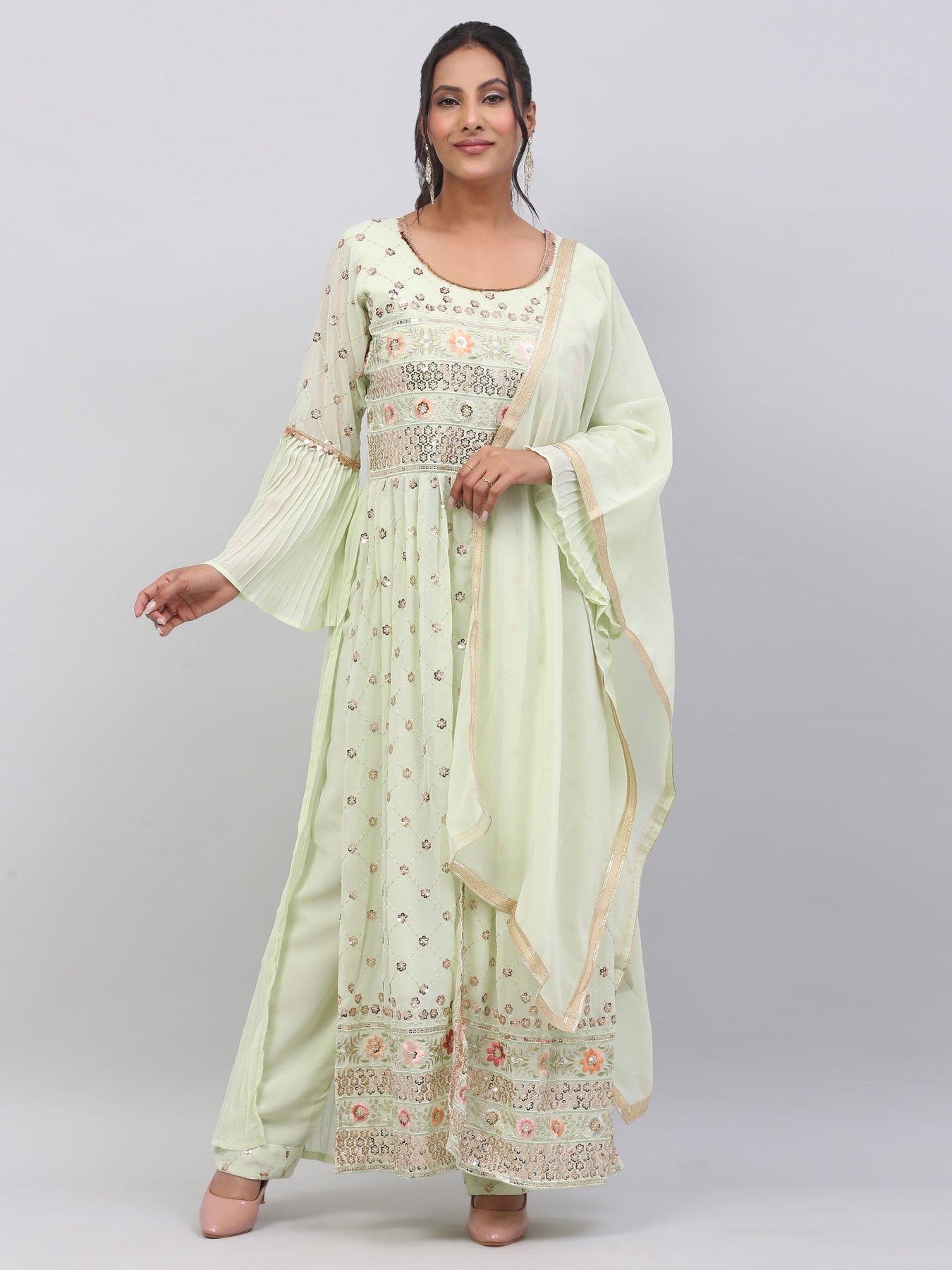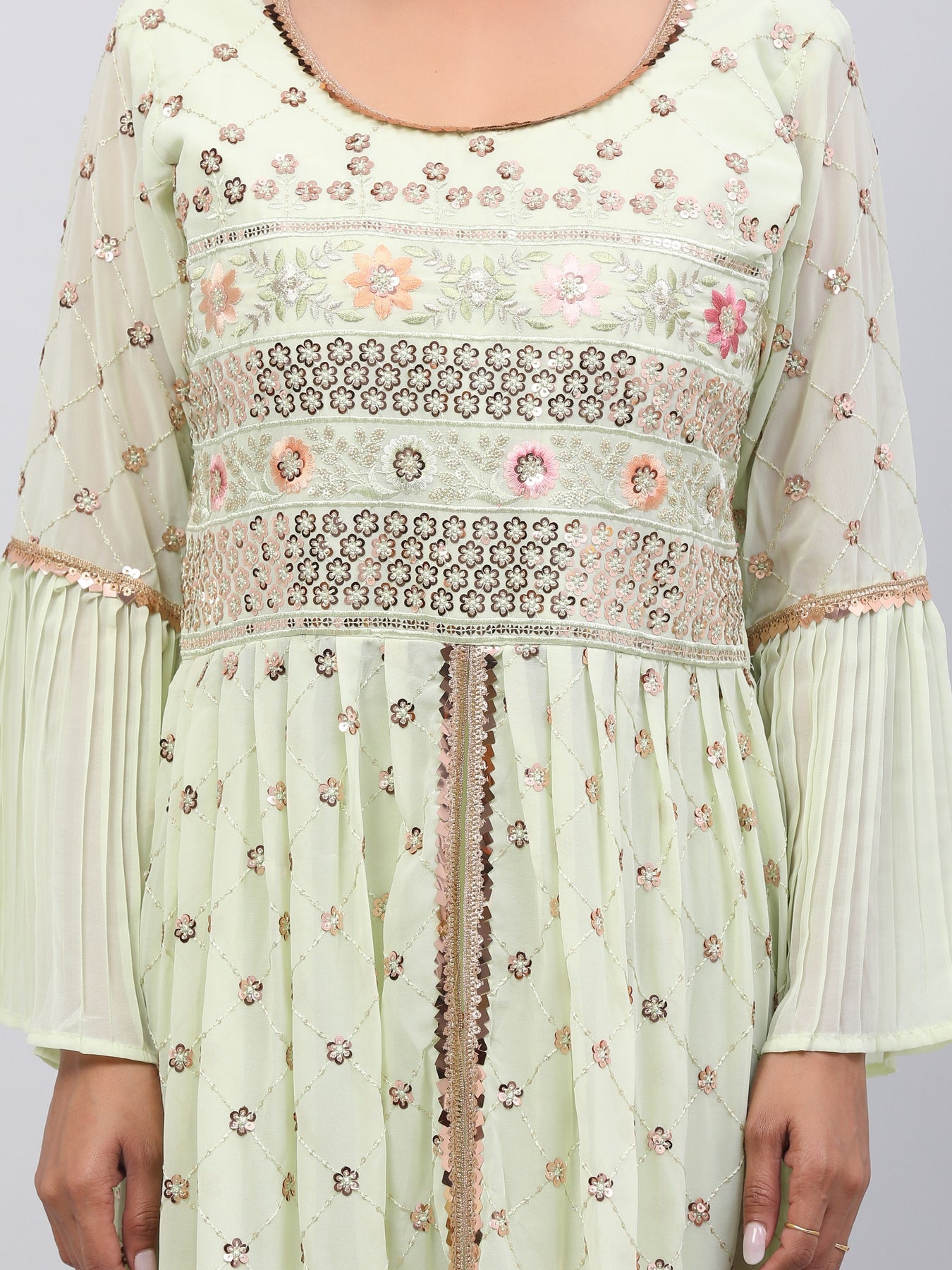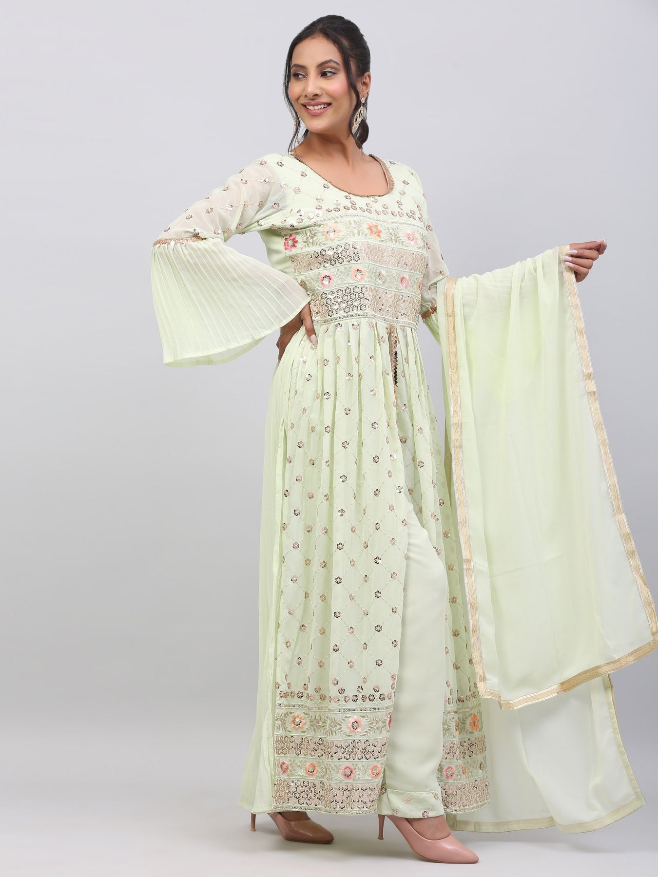 Georgette sequin work kurti with embroidered yoke, half bell sleeves with gota detailing..