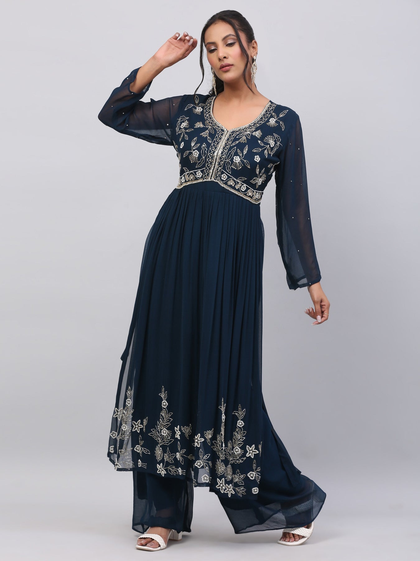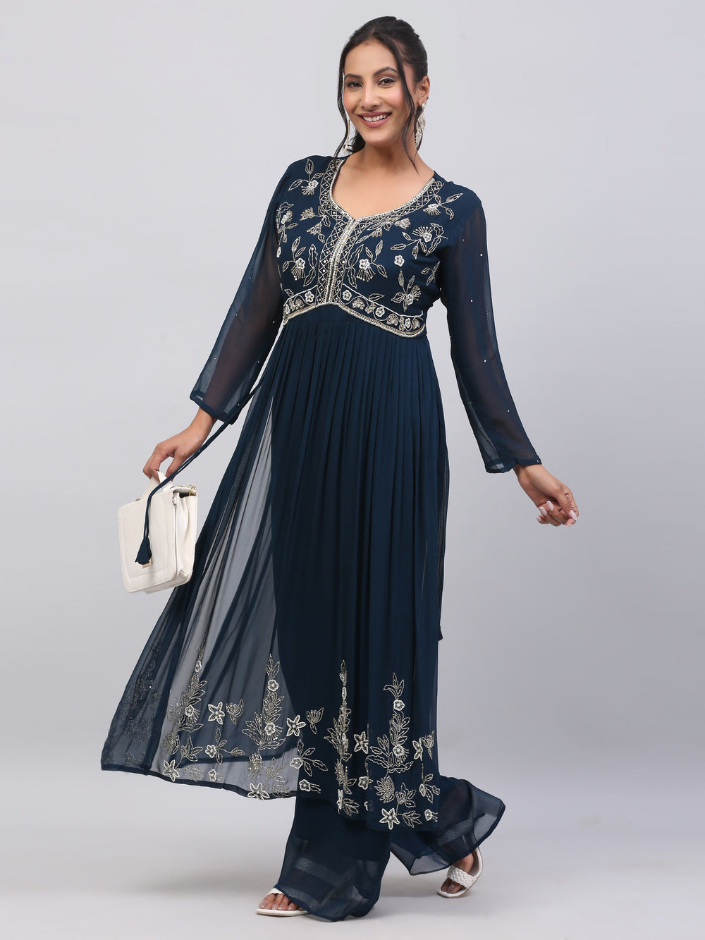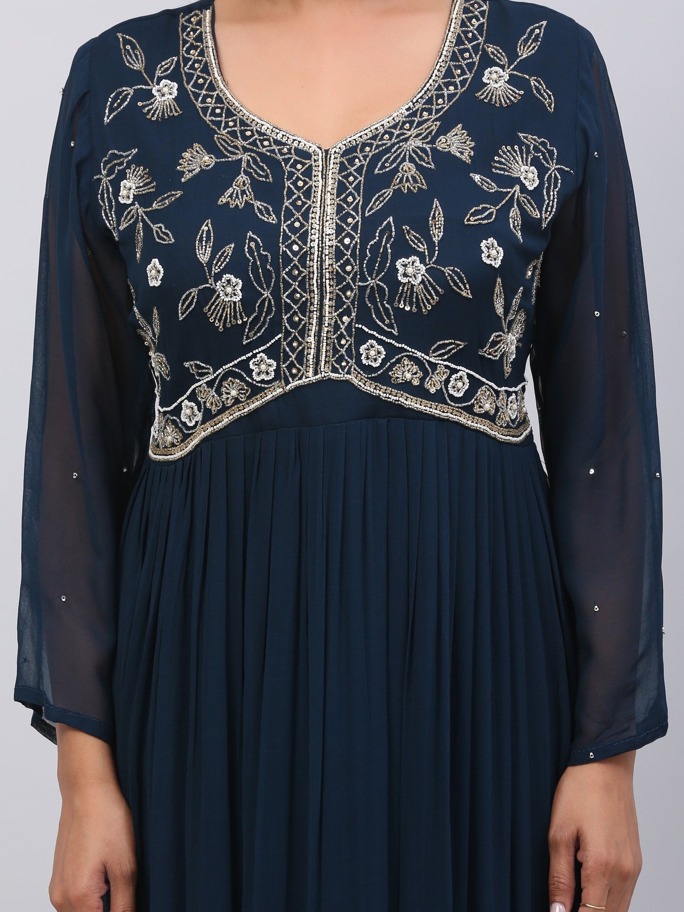 Georgette Nayra style kurti with pearl, cut dana embroidery on yoke..