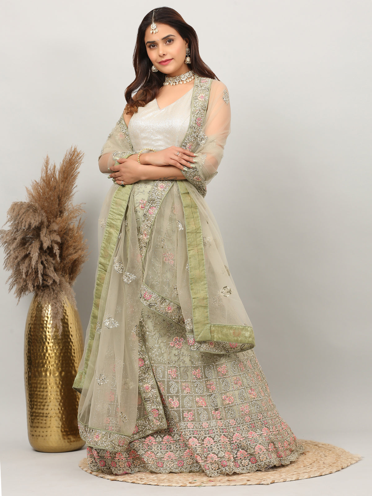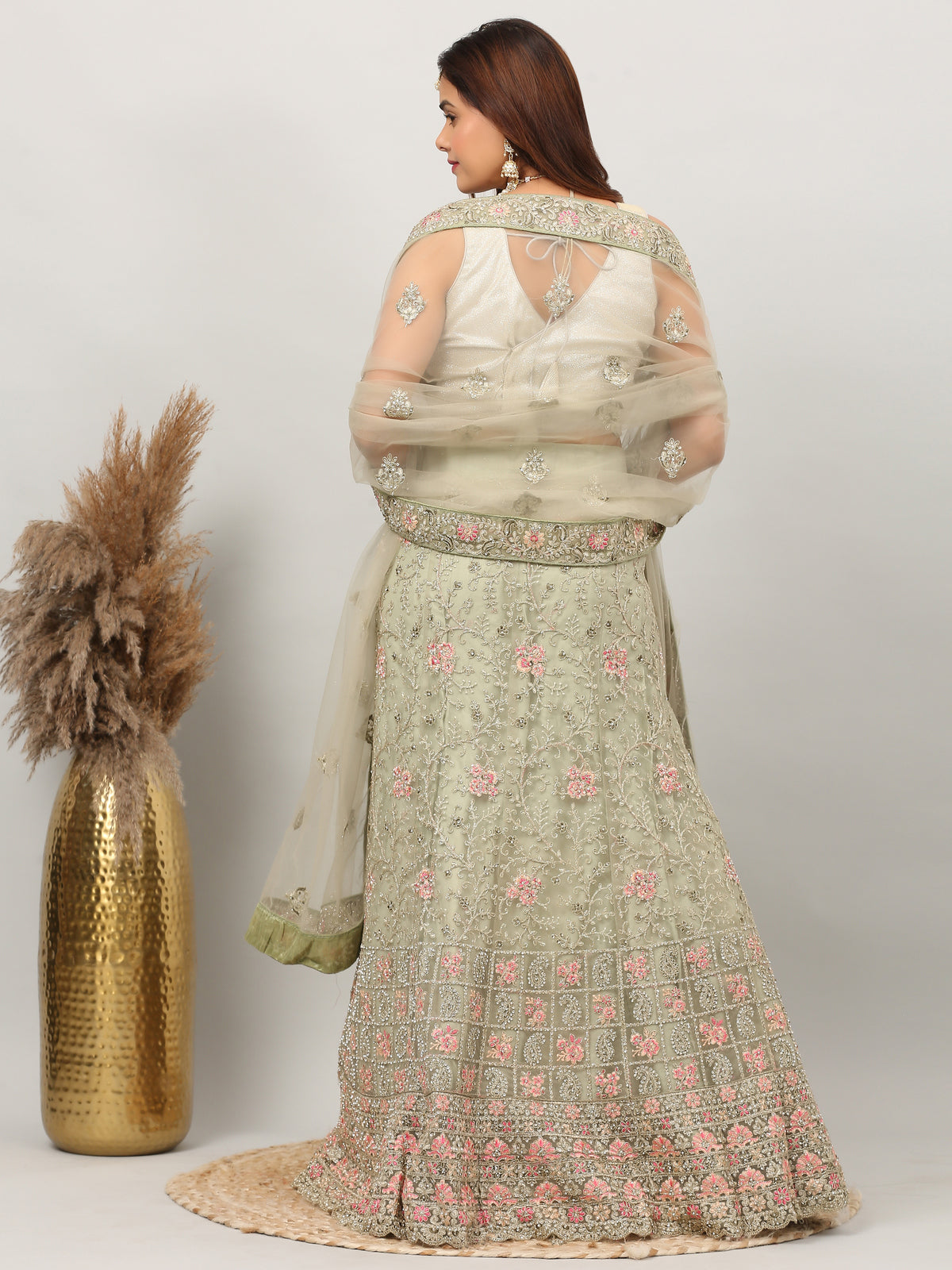 Stunning Mint Green Lehenga with intricate Pearl and stone work all over skirt and dupatta...It’s delicate Pearl and stone work embroidery on the blouse piece gives it a heavy and rich look...This is a perfect outfit for an evening sangeet or festive event..