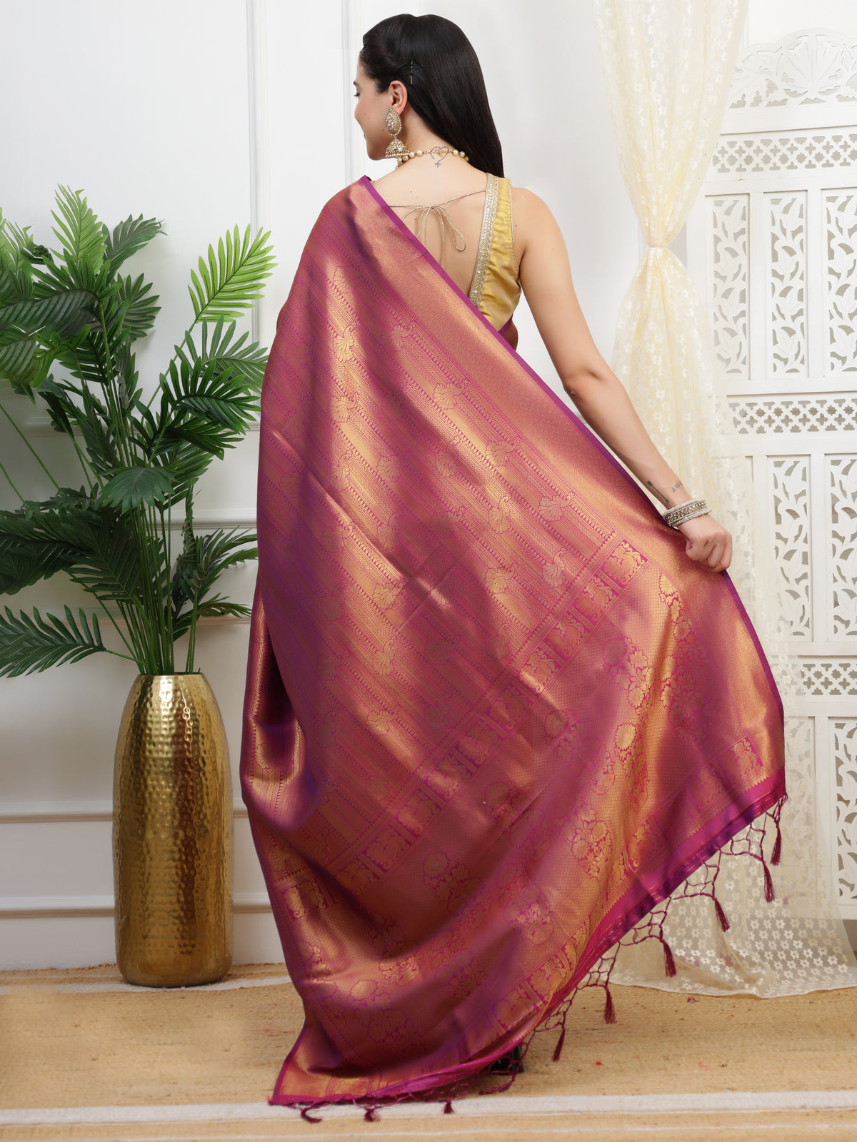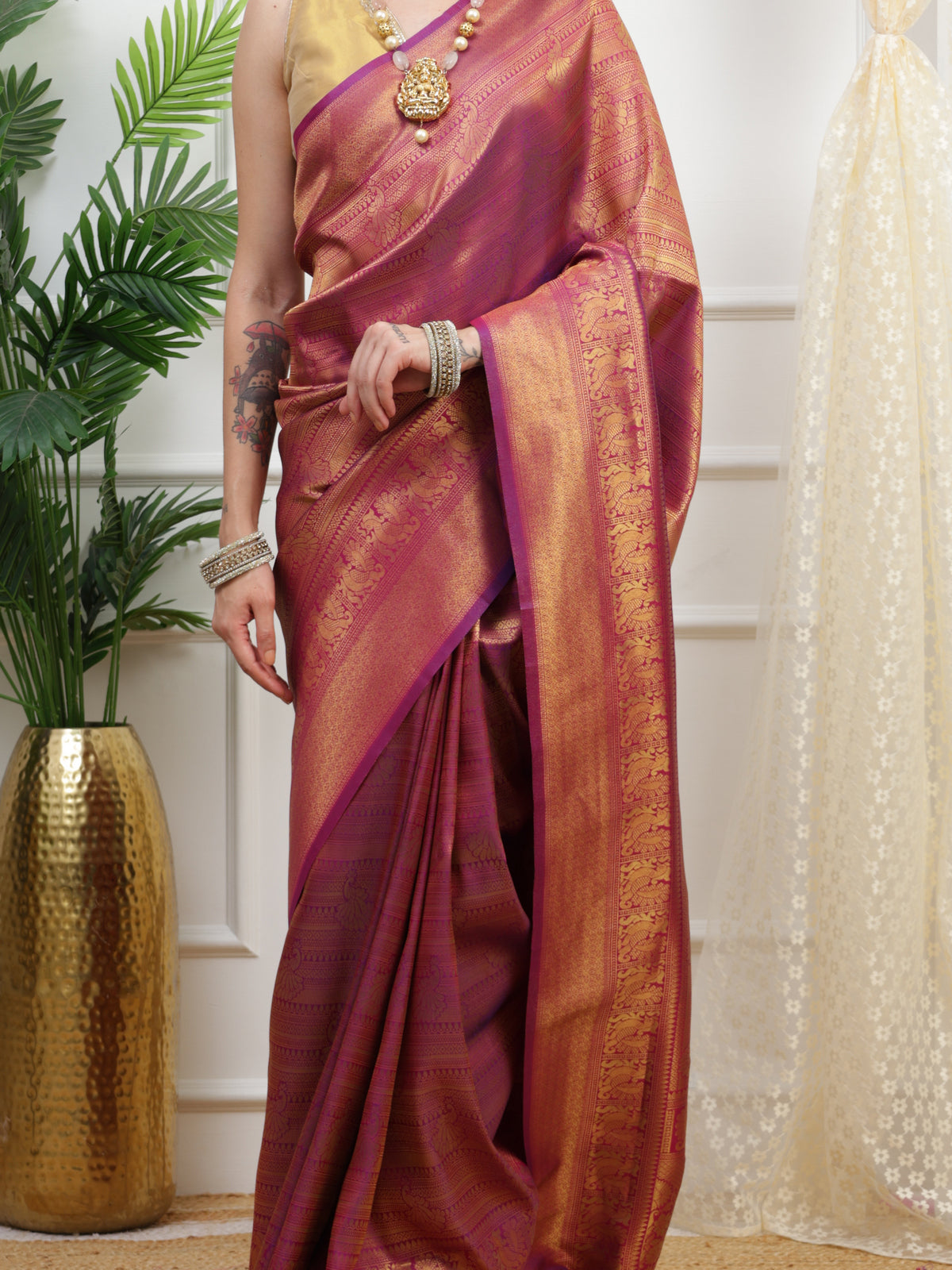 Uniquely crafted Woven Silk Saree with zari weaving giving it a rich and luxurious texture...This Saree displays the traditional all over pattern with a modern touch to give it a timeless appeal...The fabric drapes well and is enhanced by a gorgeous Pallu and blouse piece..