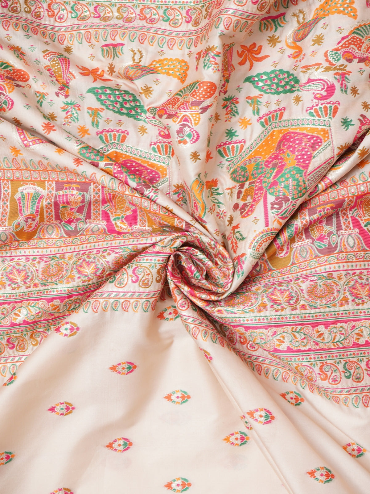 This Pashmina Silk Saree with woven Zari and Meena motifs is a classic Saree with Figure border and intricately woven Pallu displaying the craftsmanship of these unique traditional Sarees...The elegant charm of these Sarees make them ideal for festivals and events..