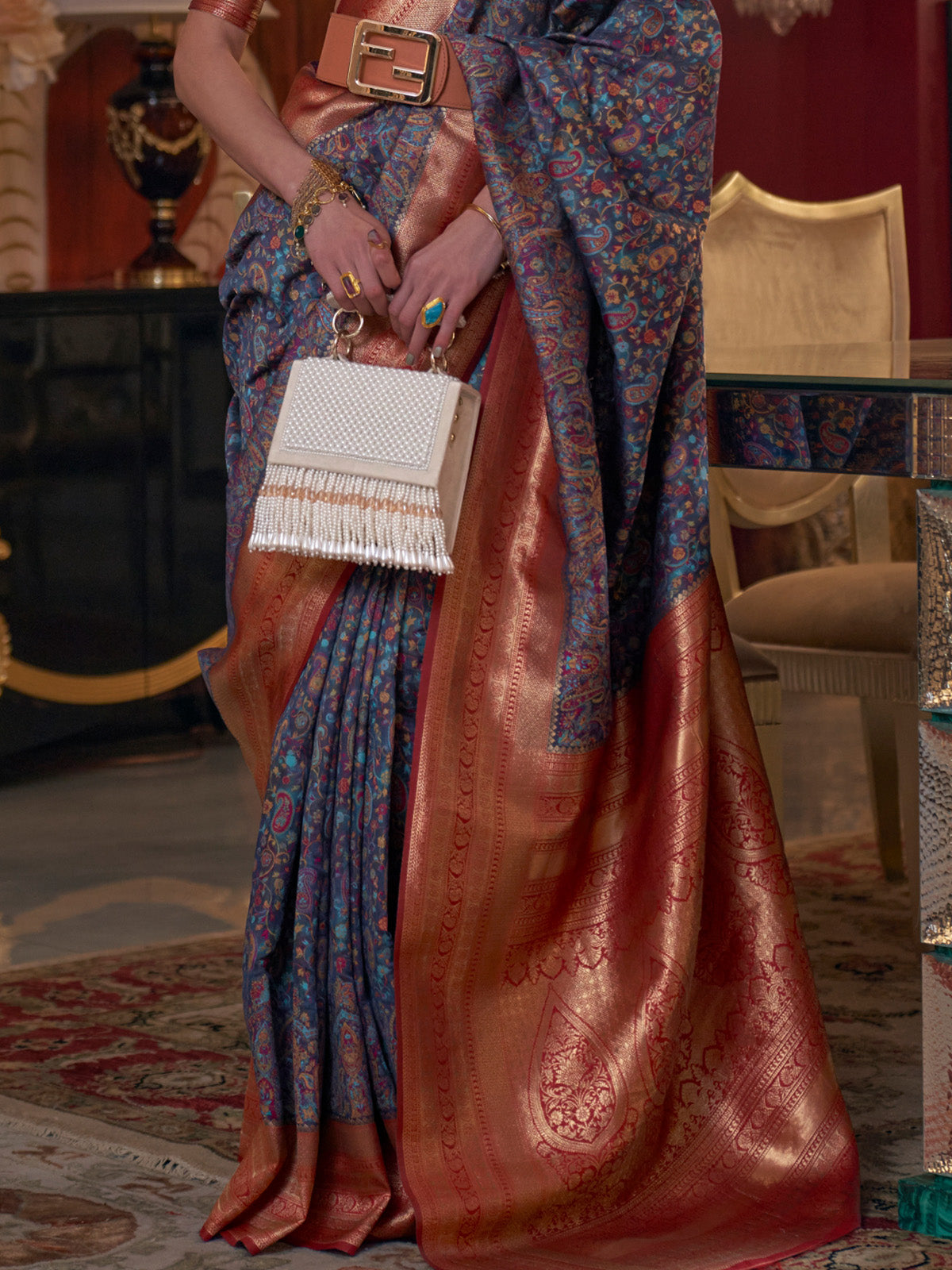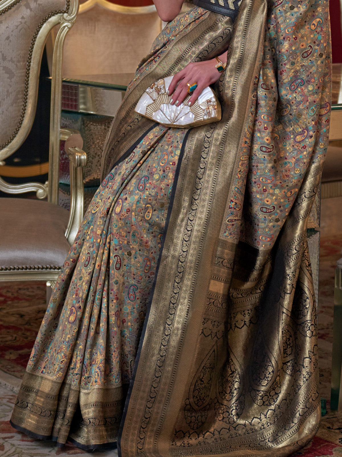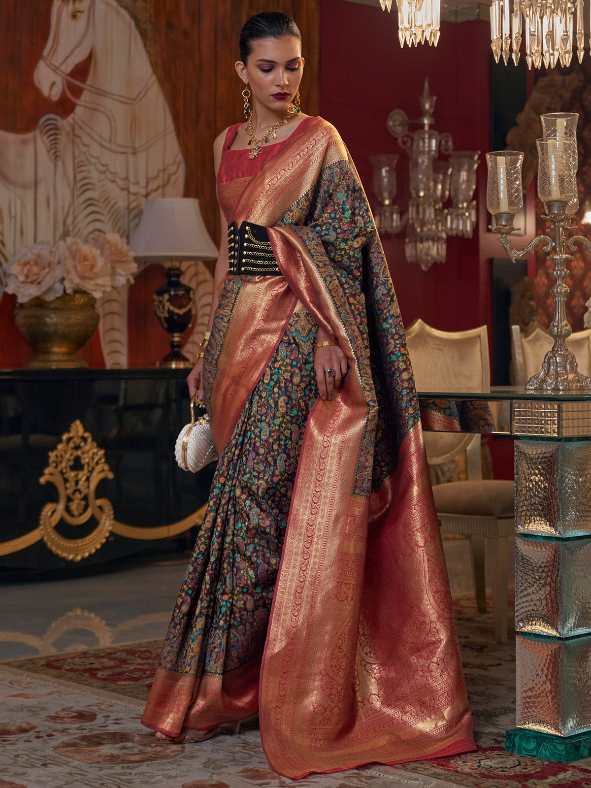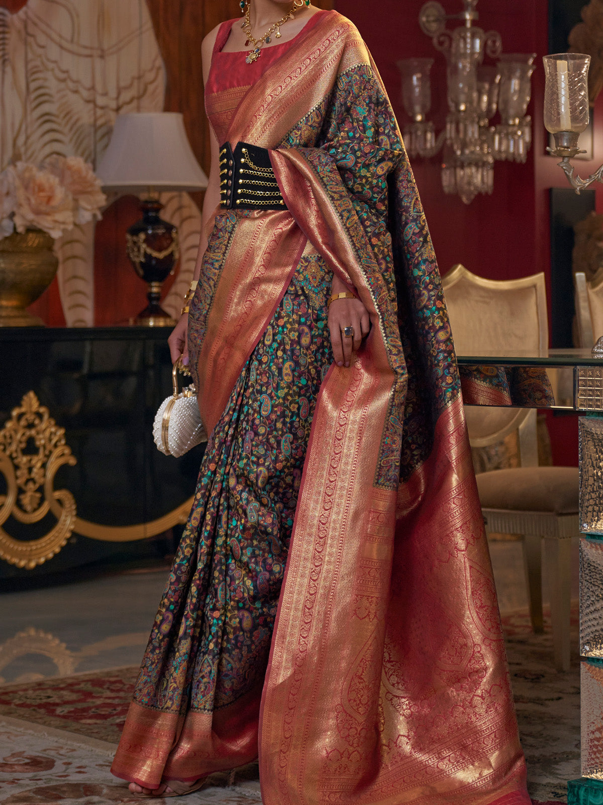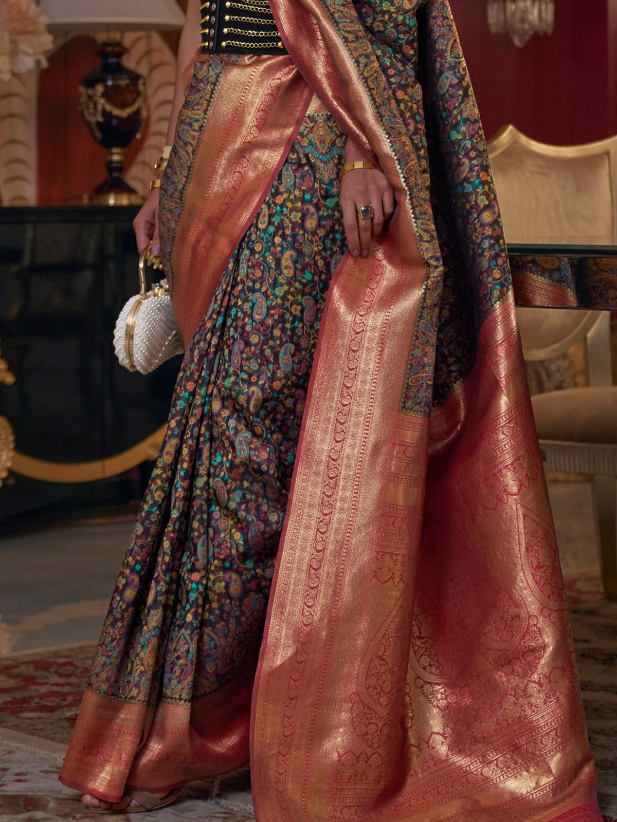 Exquisite Kashmiri work Modal Silk Sarees with intricate weave for that traditional look.. This Saree exudes an elegance and showcases the mastery of the skilled artisans giving it a timeless appeal...The fabric drapes well and is enhanced by contrast border and gorgeous Pallu..