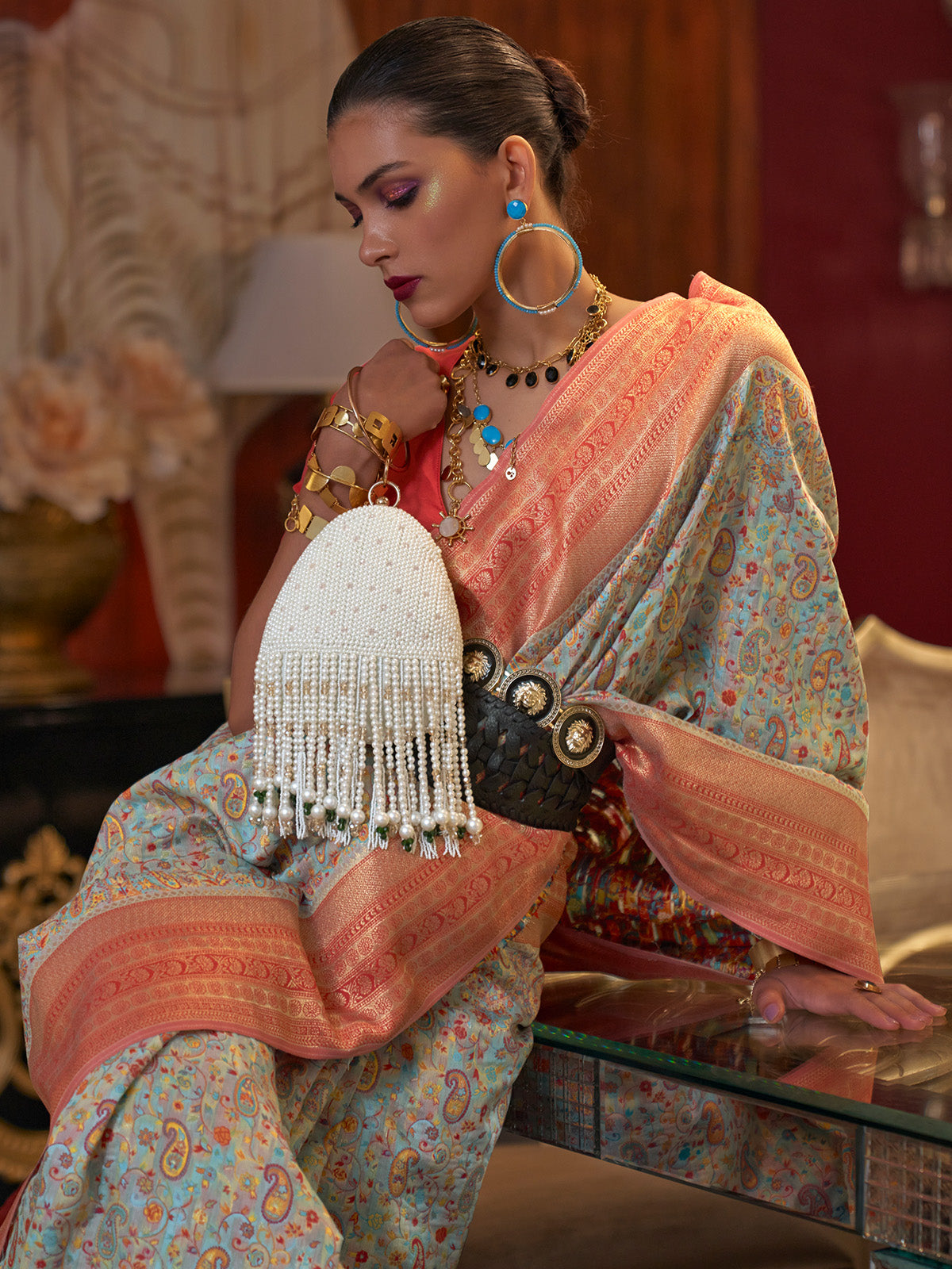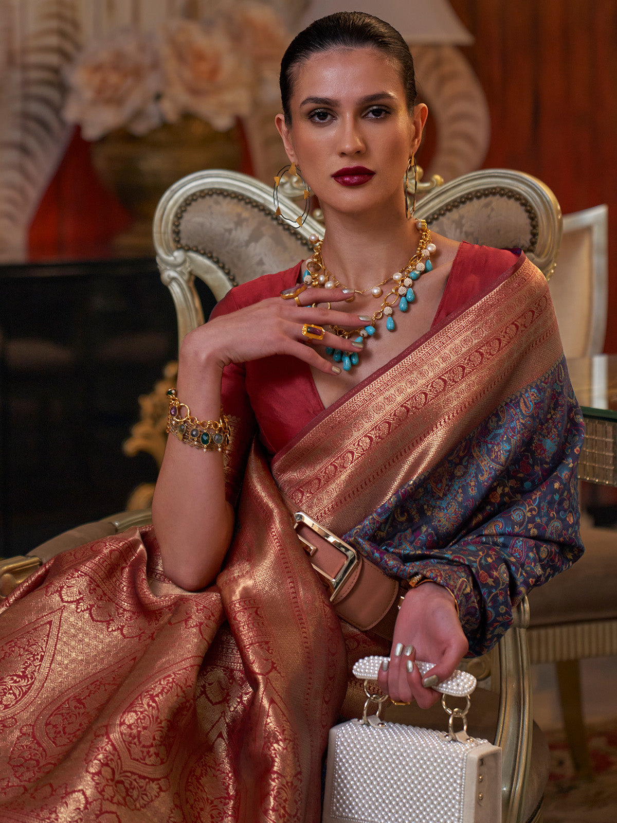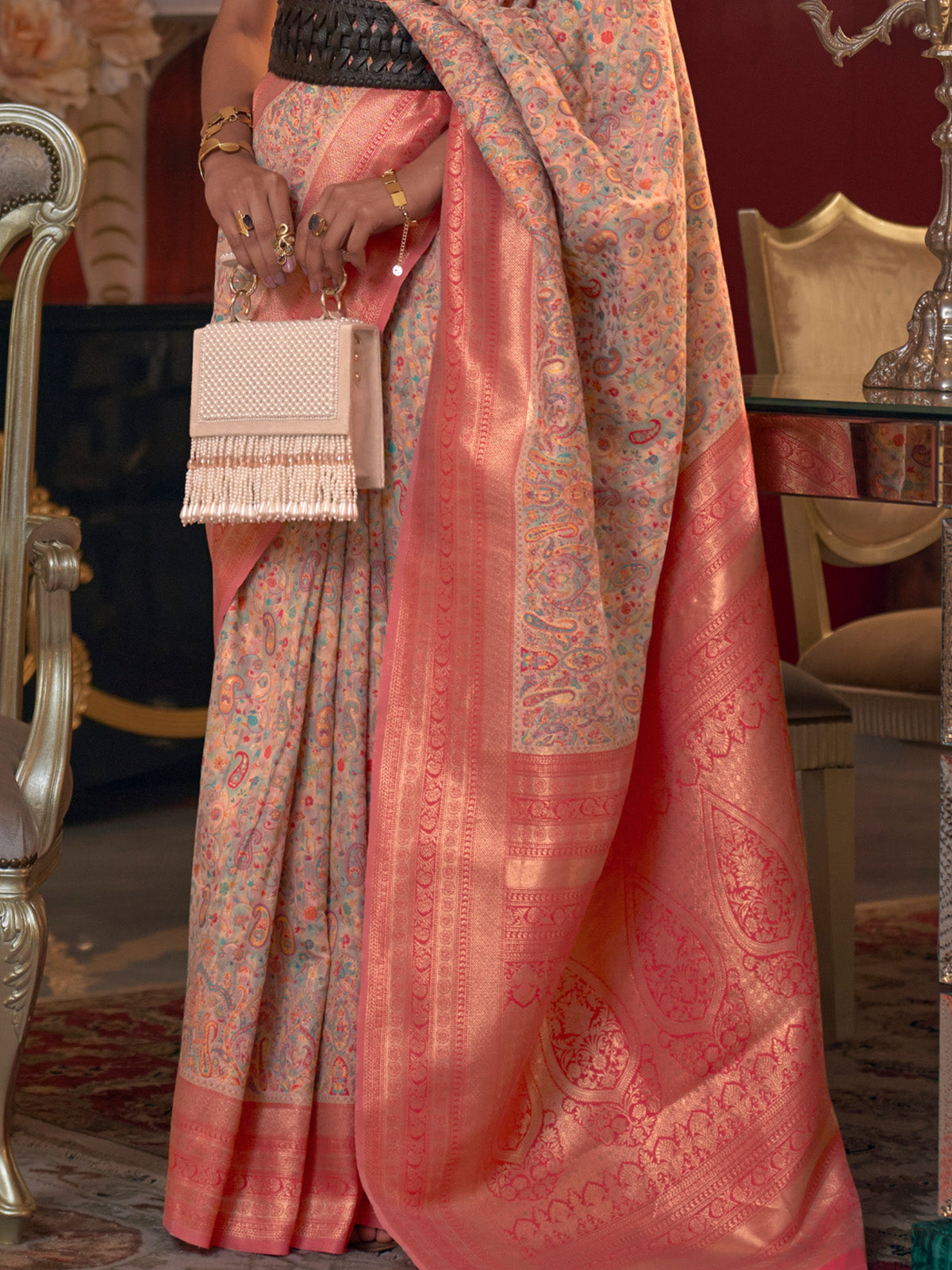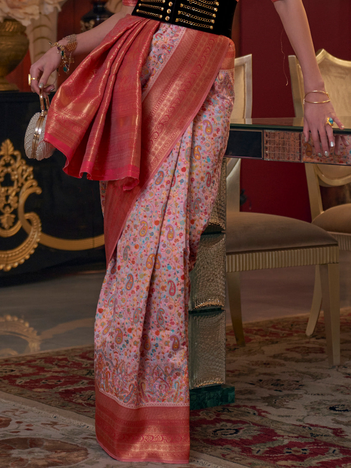 Exquisite Kashmiri work Modal Silk Sarees with intricate weave for that traditional look.. This Saree exudes an elegance and showcases the mastery of the skilled artisans giving it a timeless appeal...The fabric drapes well and is enhanced by contrast border and gorgeous Pallu..