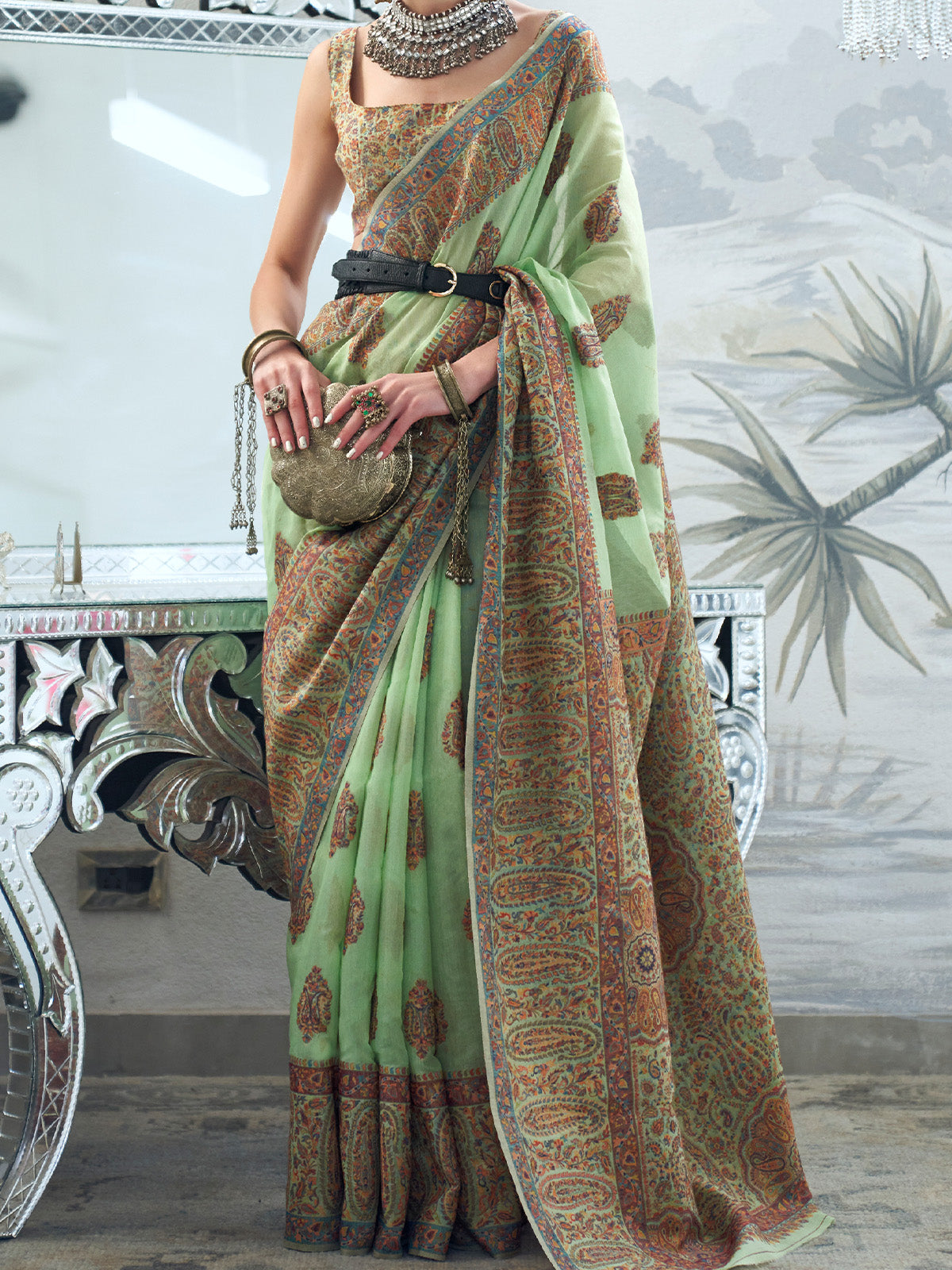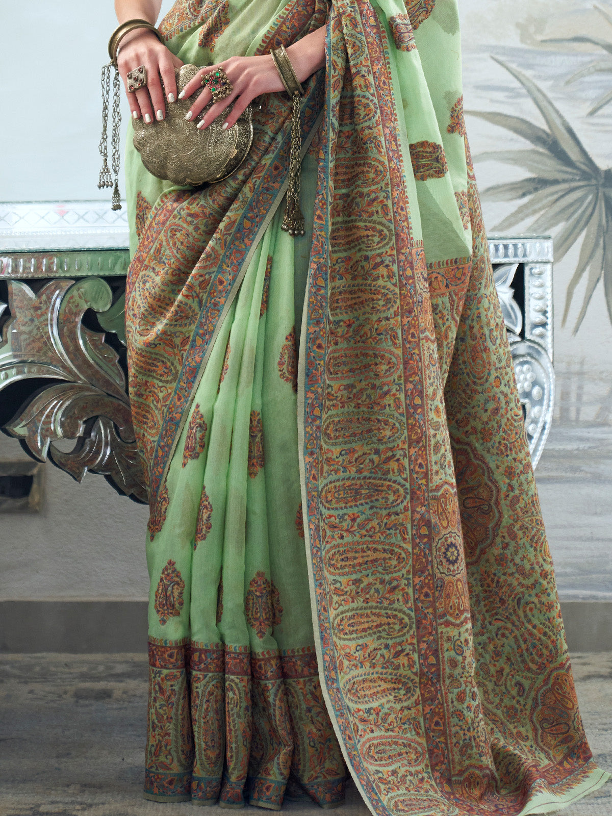 Exquisite Kashmiri work Handloom Sarees with beautiful motifs and intricate woven pallu for that traditional look.. This Saree exudes an elegance and showcases the mastery of the skilled artisans giving it a timeless appeal...