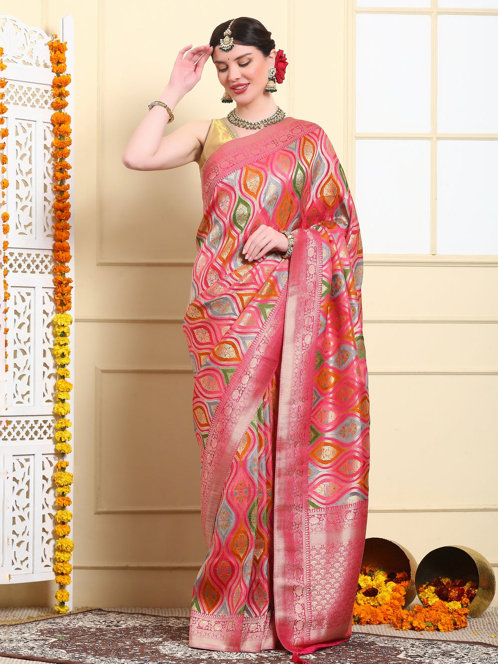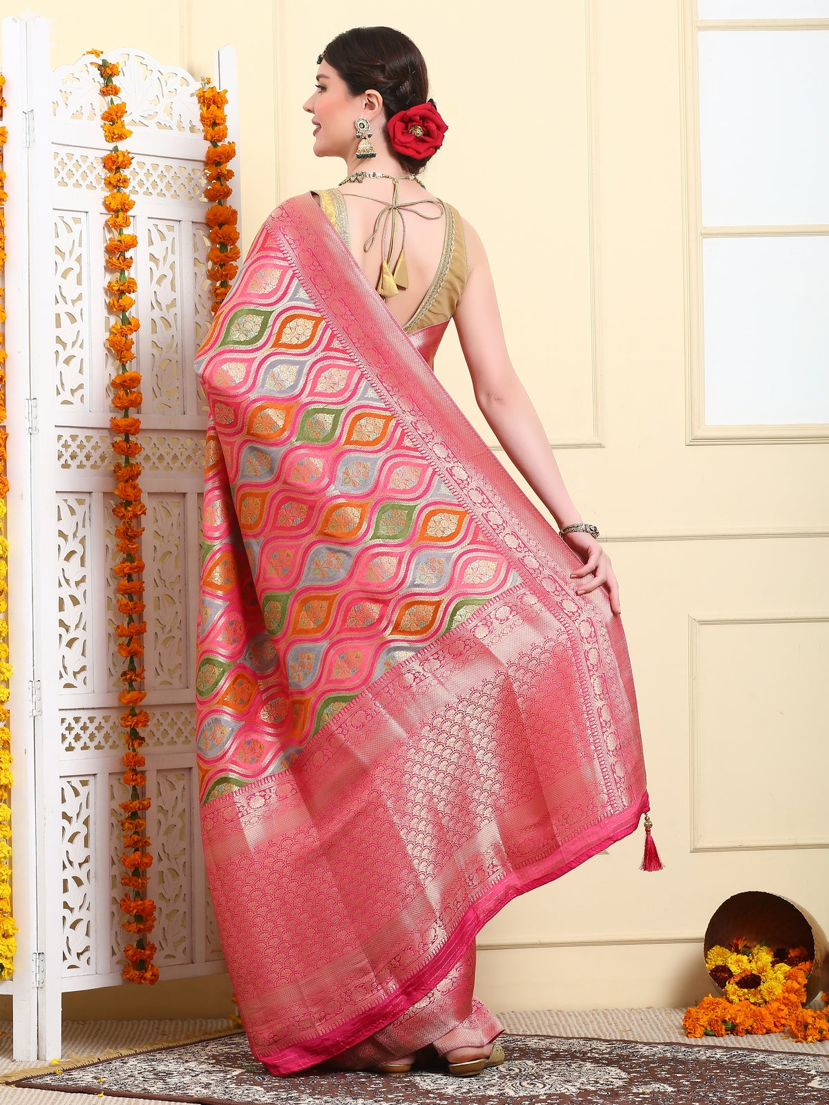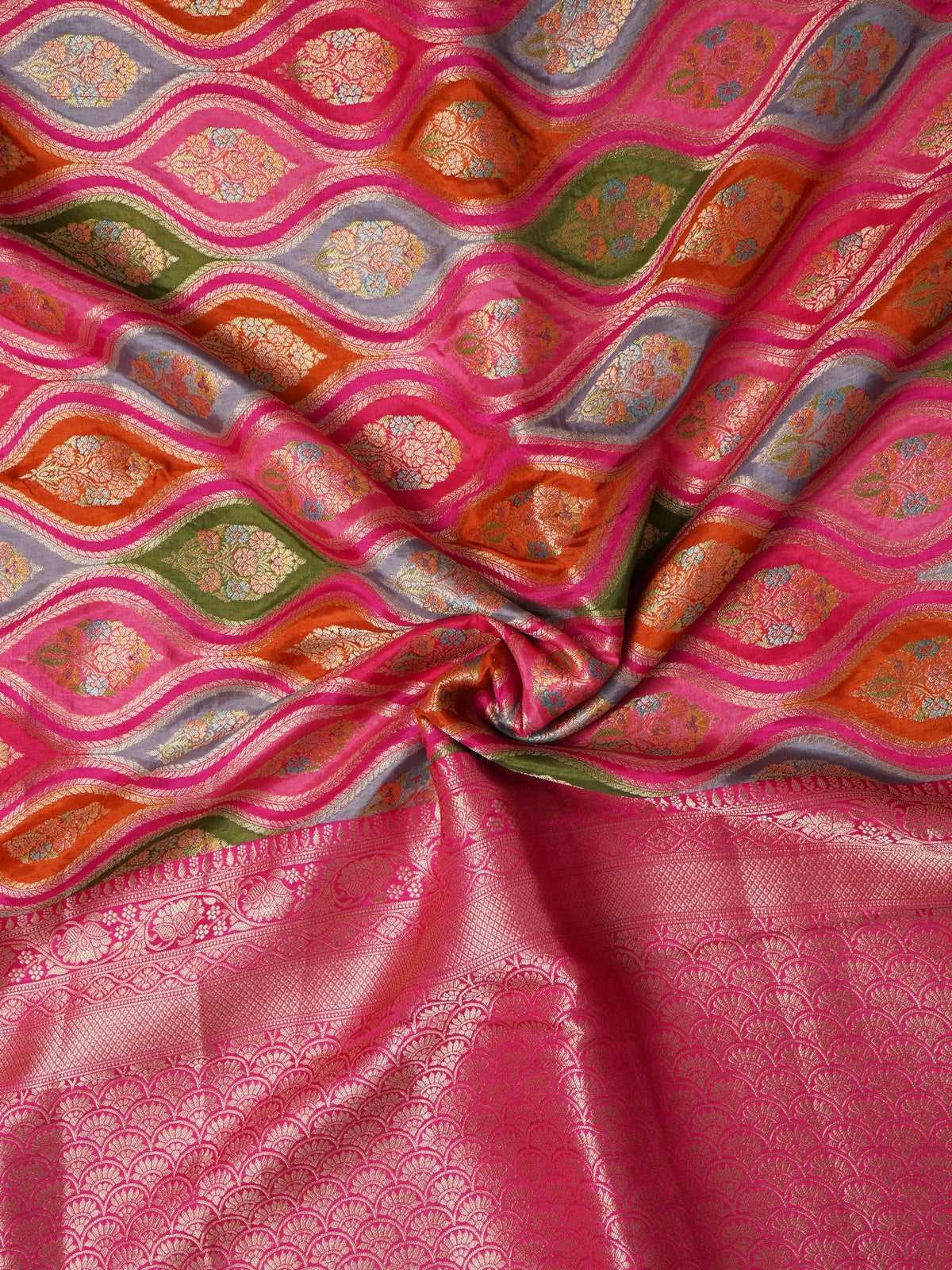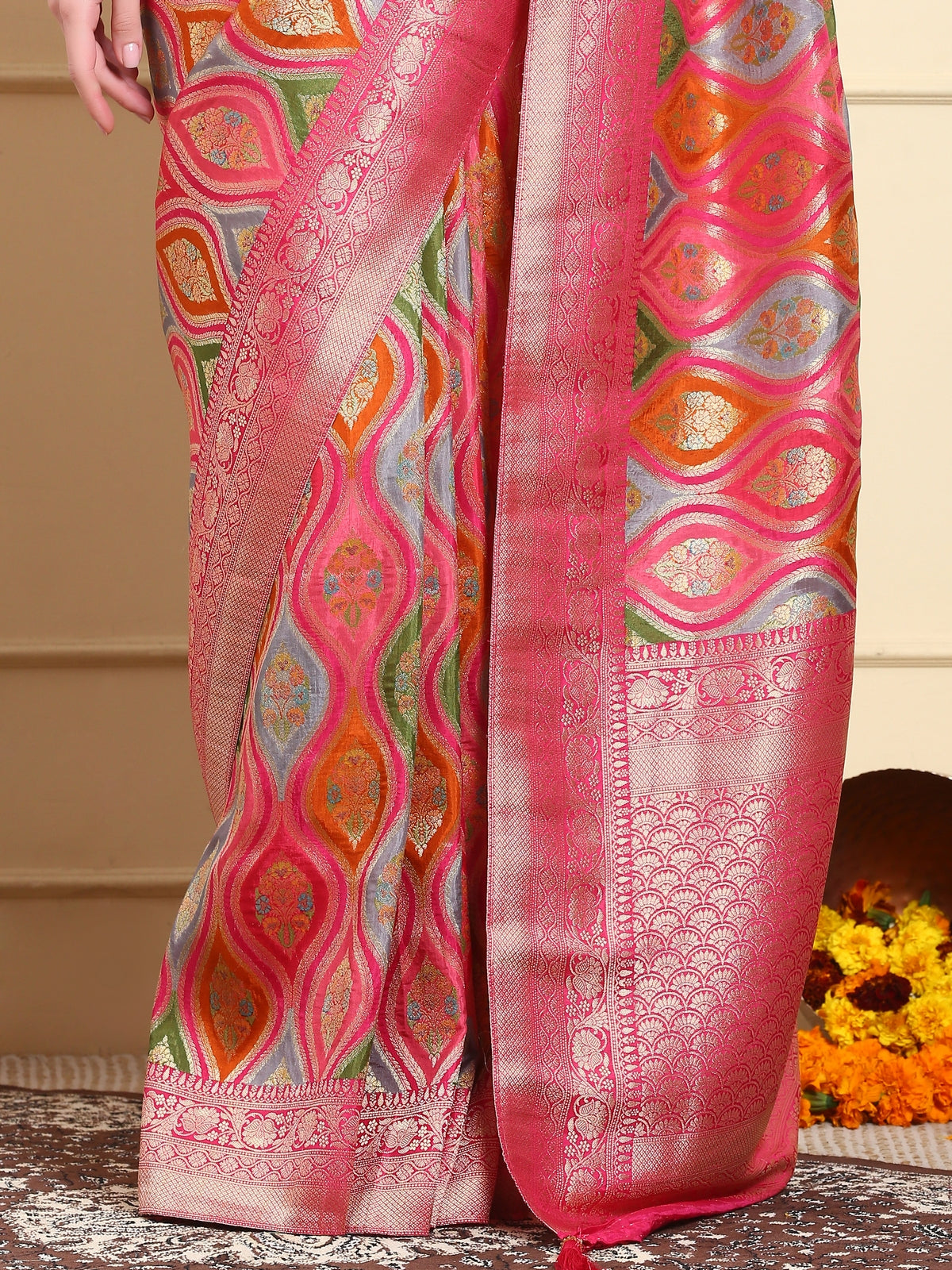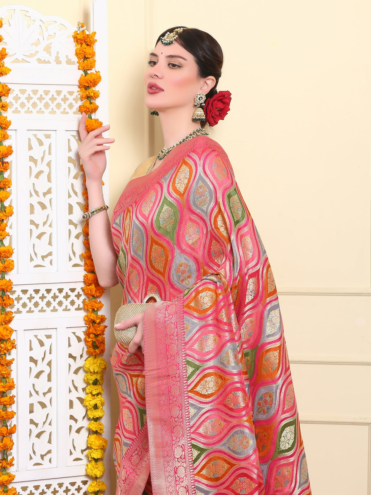 This Banarasi Saree with heavy border and Pallu is a timeless treasure woven in traditional Rangkaat style which is a skillfull intermingling and fusion of multiple colours...The vibrant colours and weave of the Saree display our rich Indian culture and give it a touch of royalty ideal for wedding and Bridal wear..