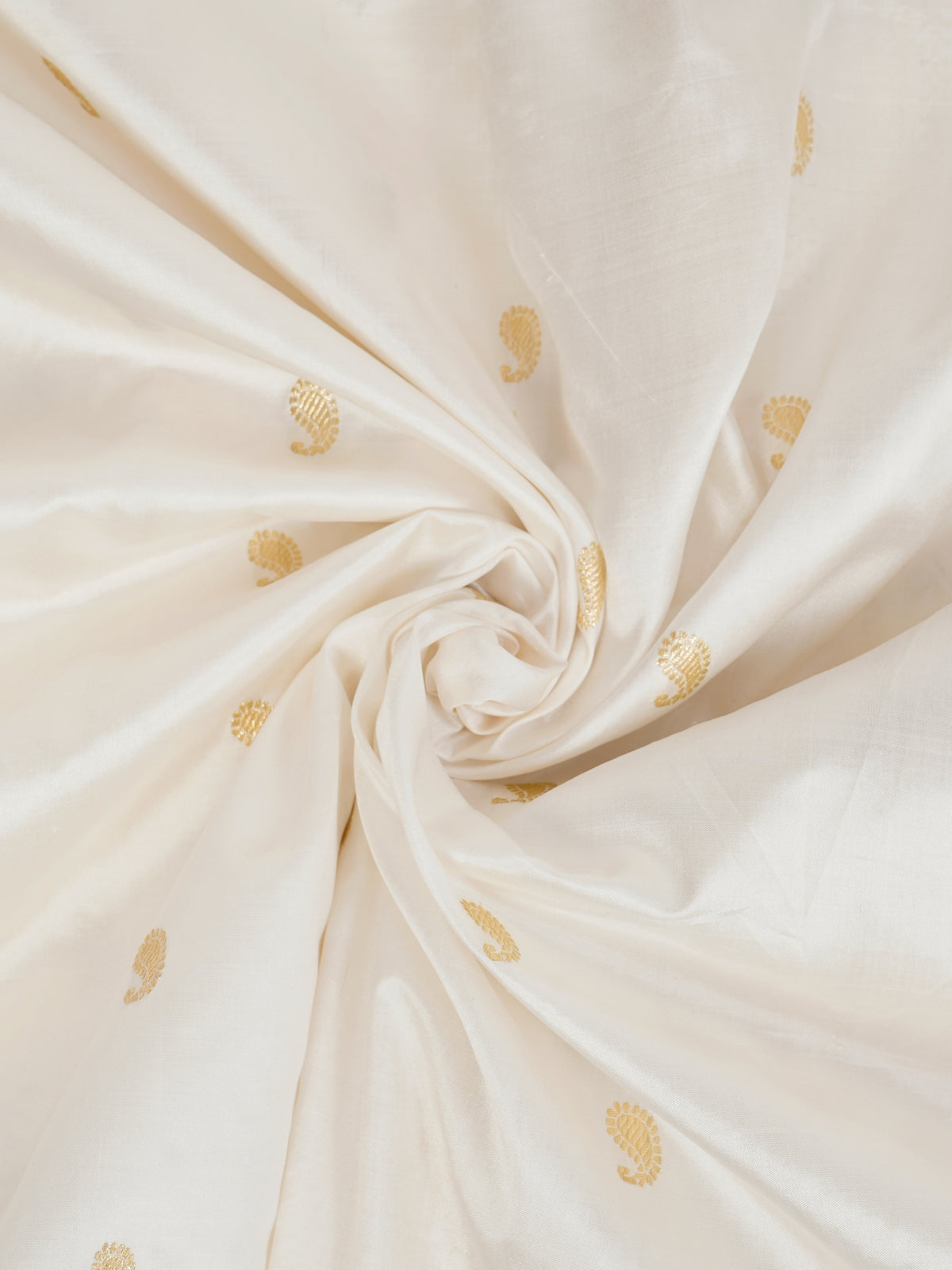 This is a rich and elegant Silk Saree with zari butti weaving giving it a traditional look...It displays the skilled craftsmanship of our weavers enhanced by a stunning Pallu lending it a timeless appeal...The fabric drapes well and has a luxurious texture ideal for festive wear..