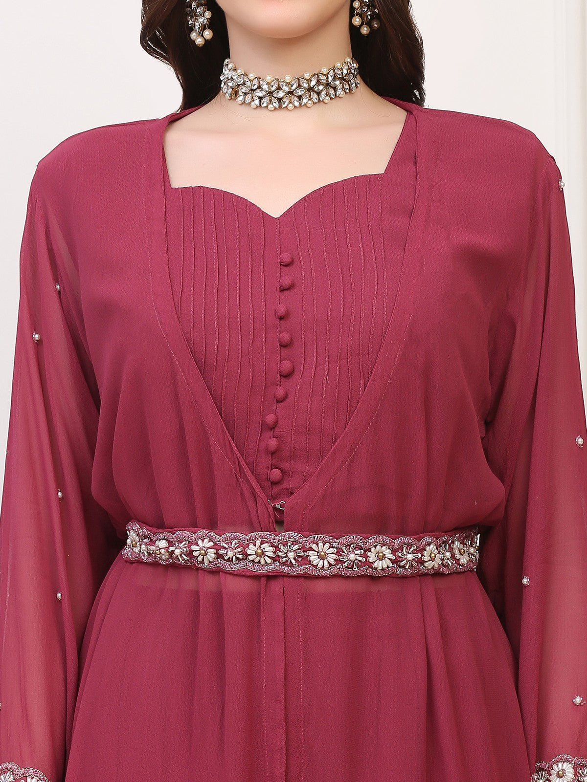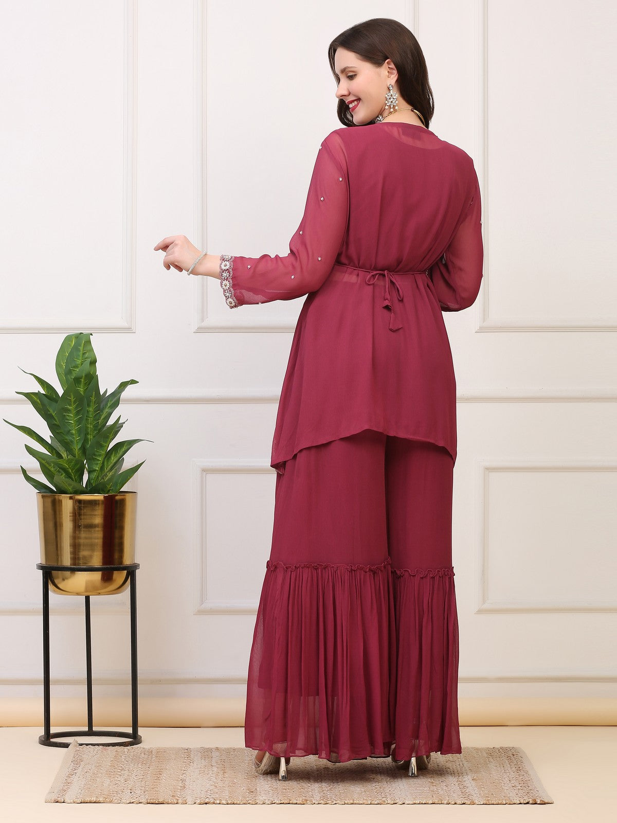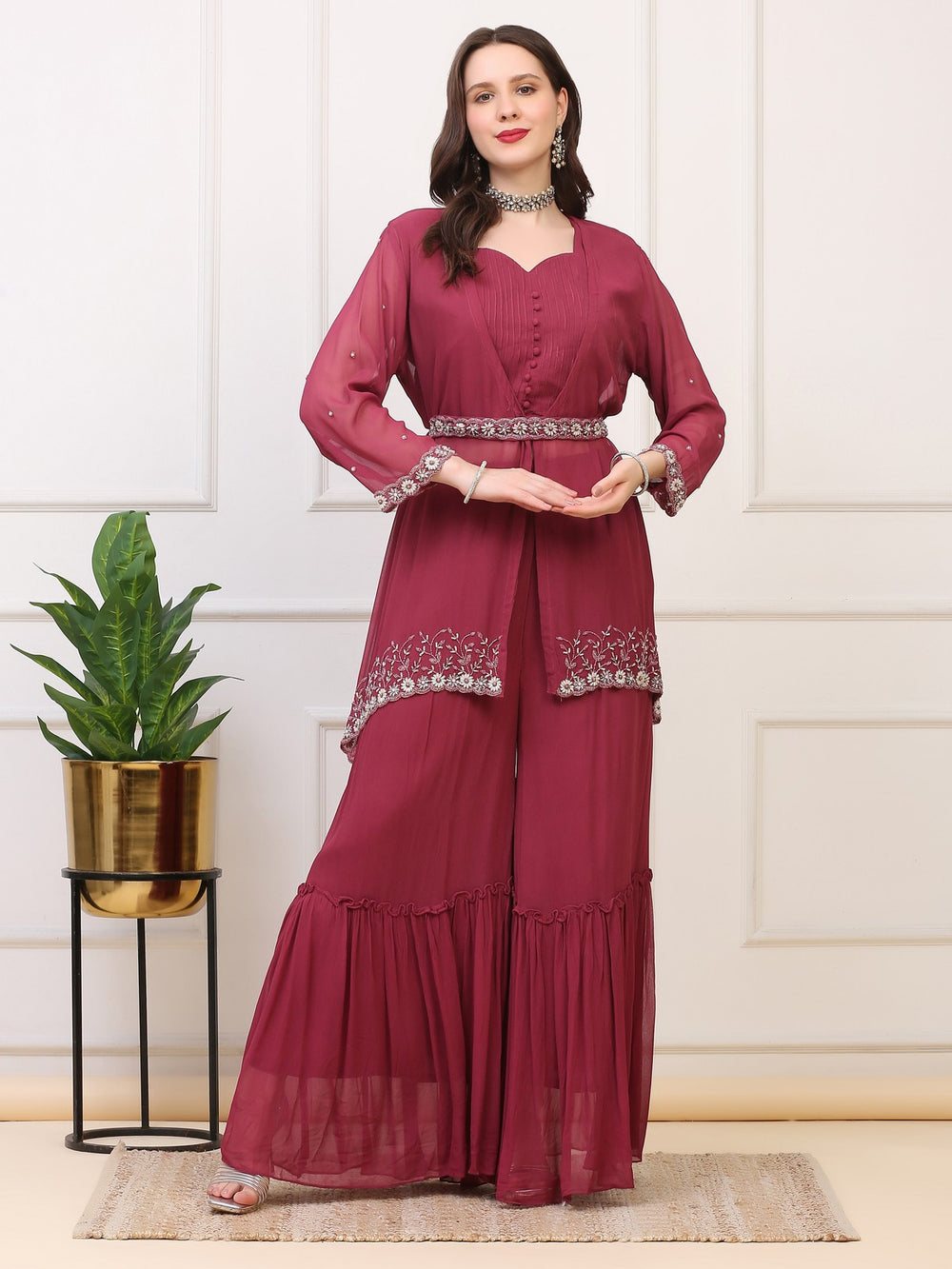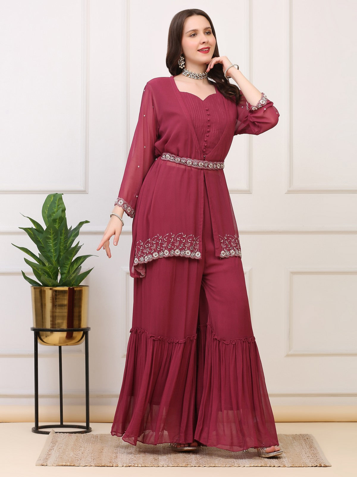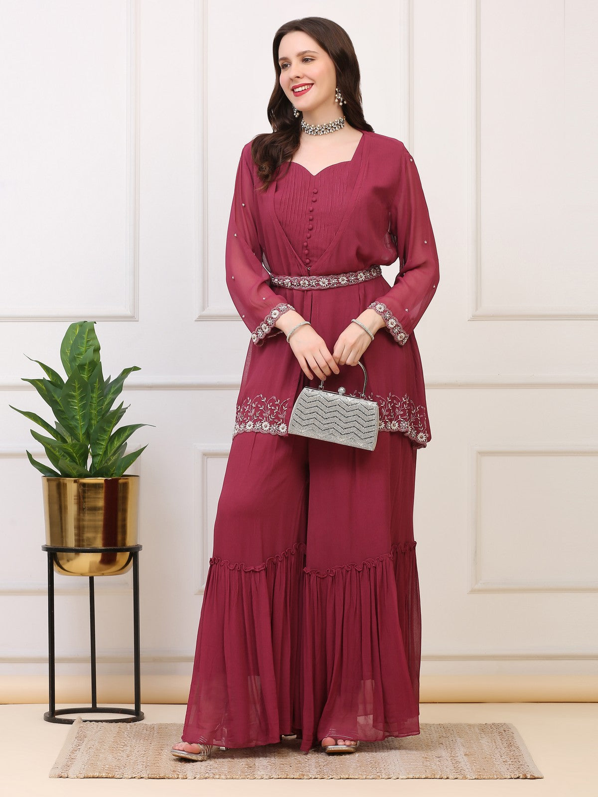 Burgundy colour Crepe Georgette flared Palazzo with embroidered Peplum top for a very trendy look..enhanced with embroidered belt..