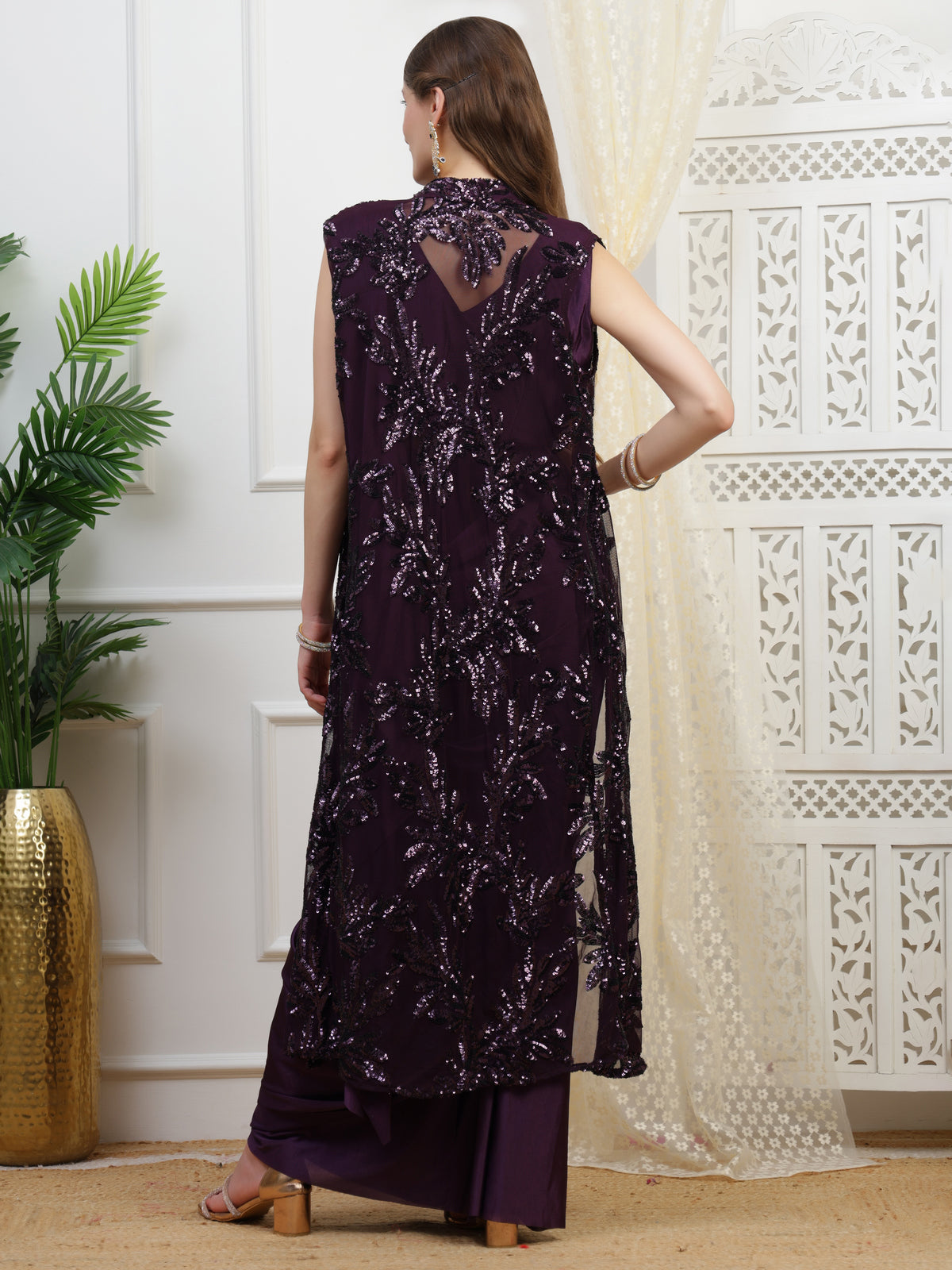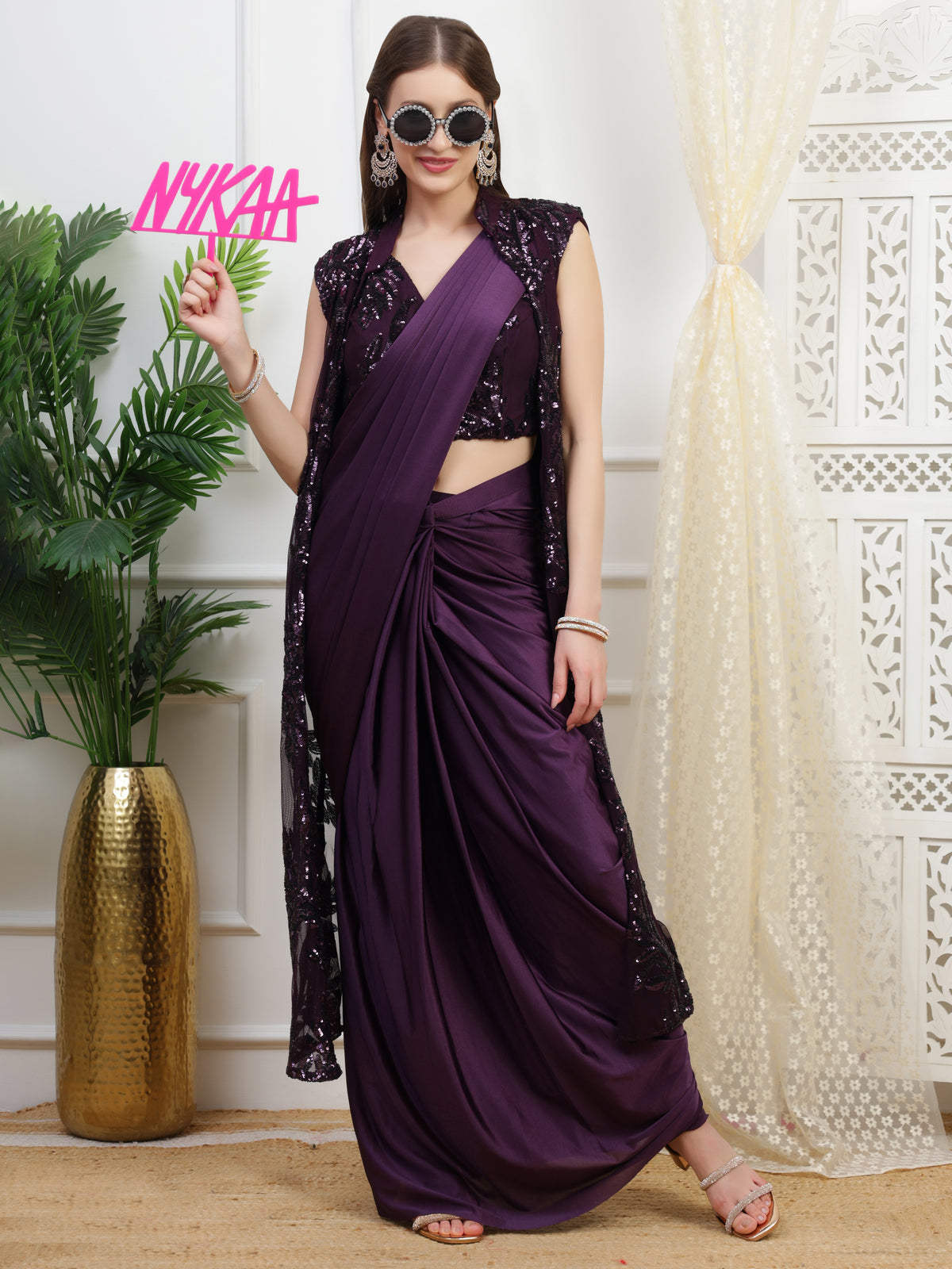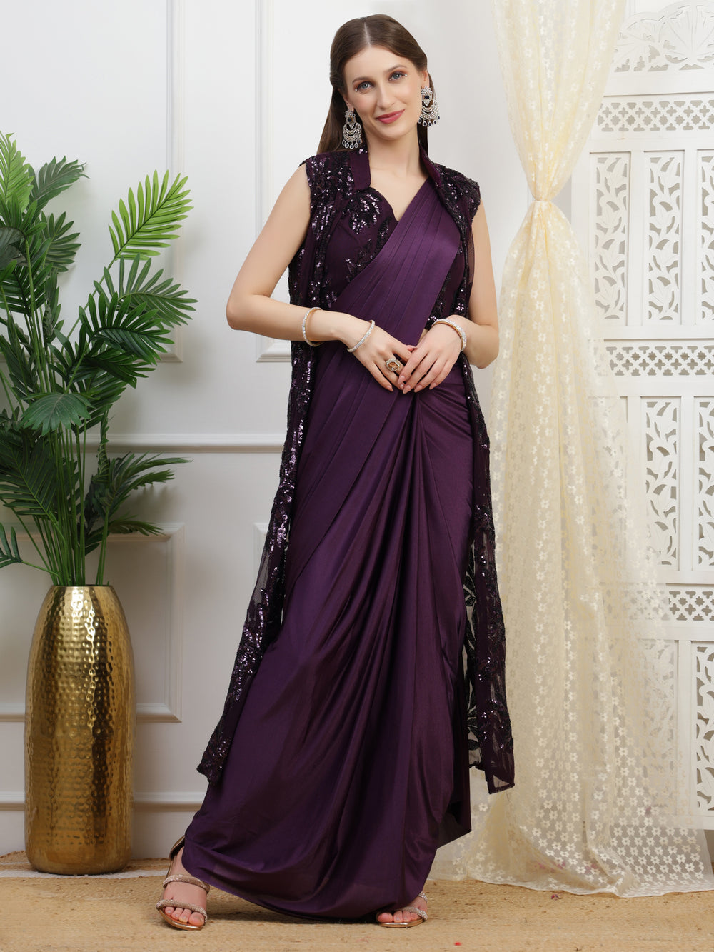 Stylish and trendy ready to wear Saree with long Cape Jacket..Easy to drape this three piece outfit creates a perfect evening look with the stunning Lycra shimmer Cape,fitted blouse and Saree..