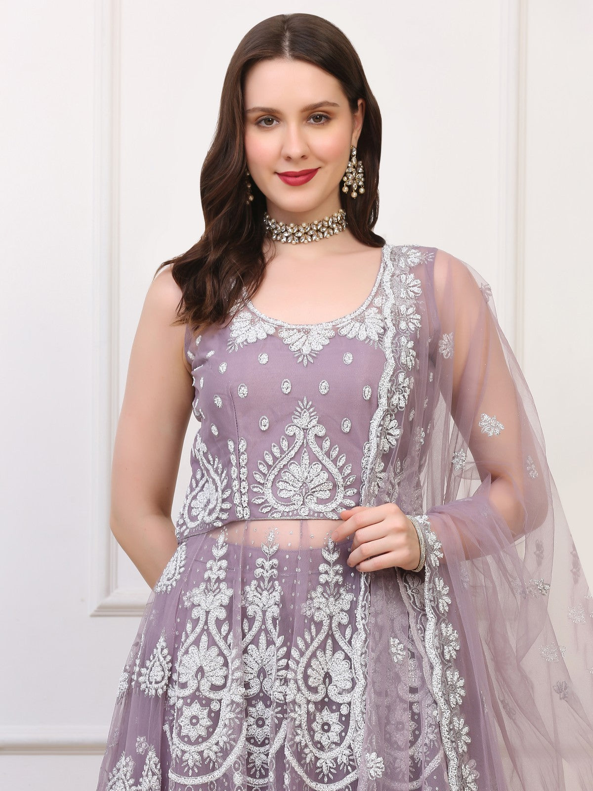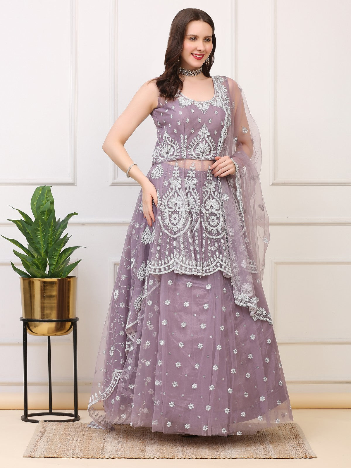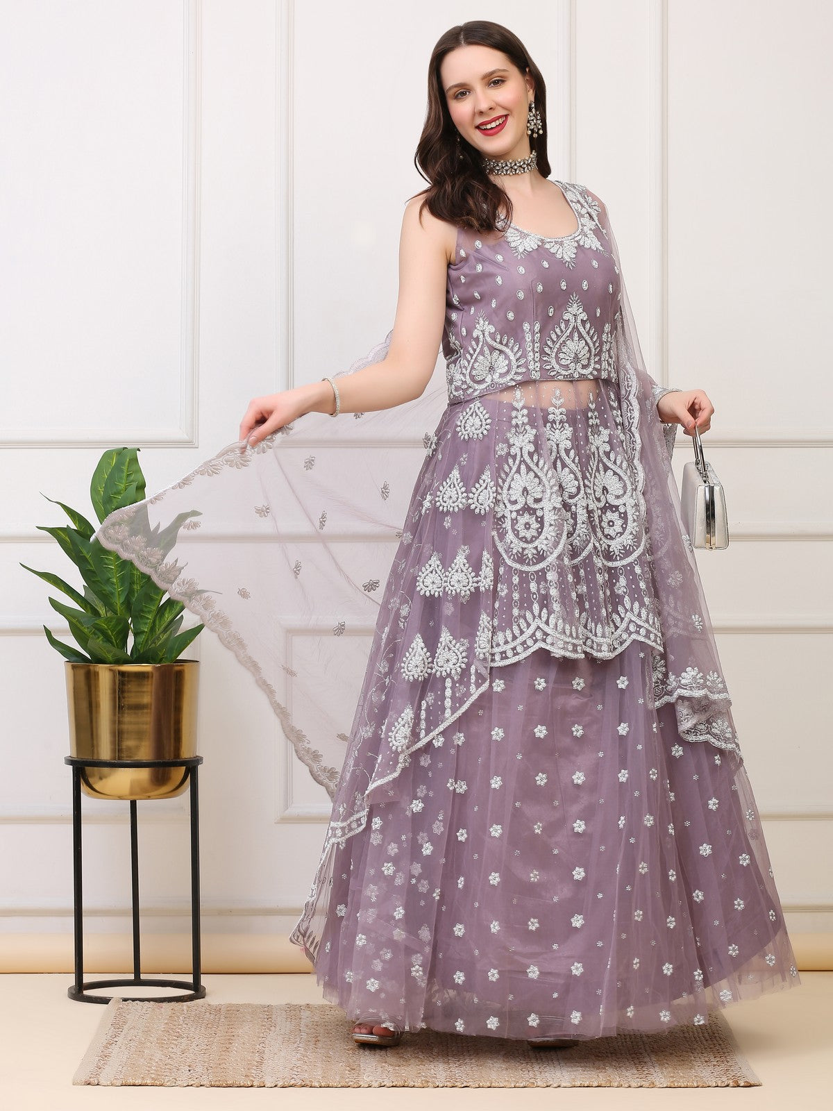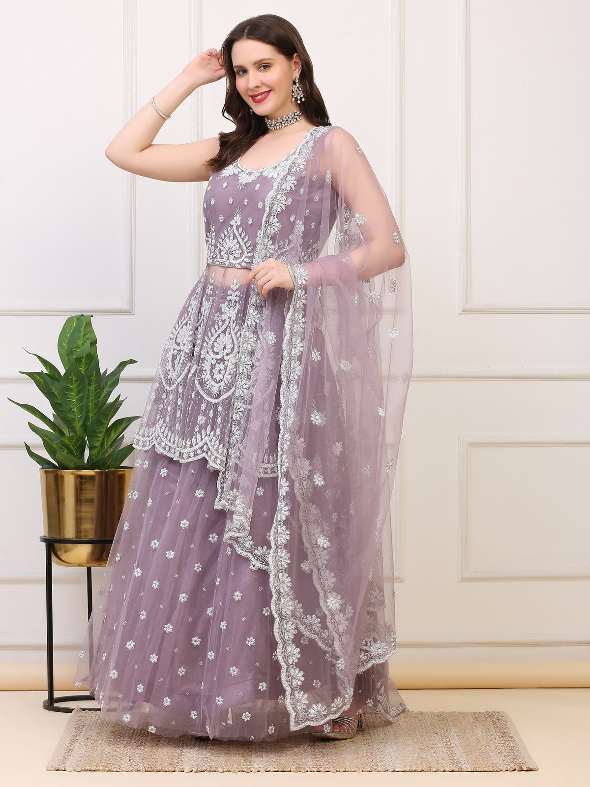 Lavendar full flare lehenga skirt with full can can...Fish tail high low top with Pearl and white zircon work enhanced with a full dupatta for a trendy look.