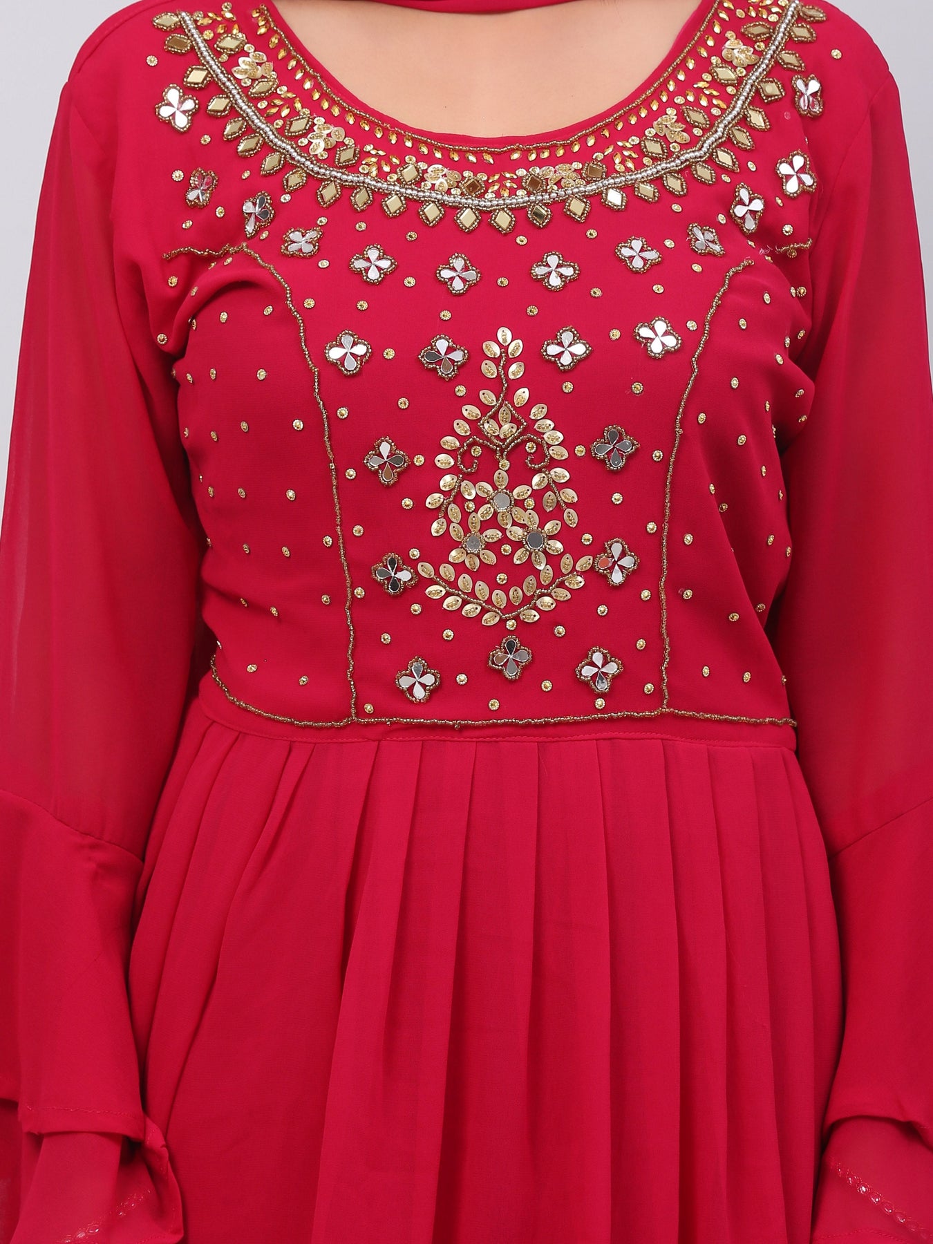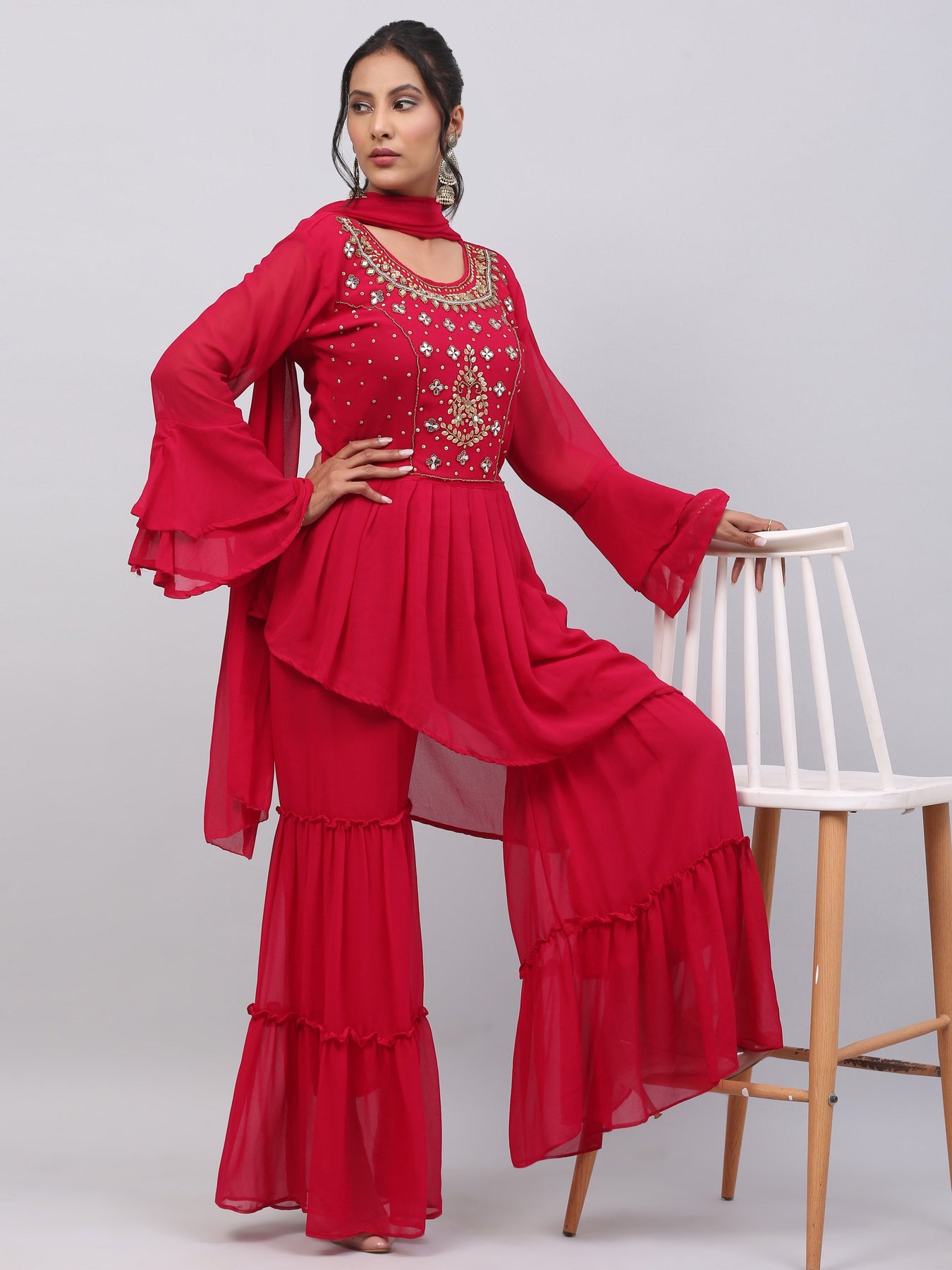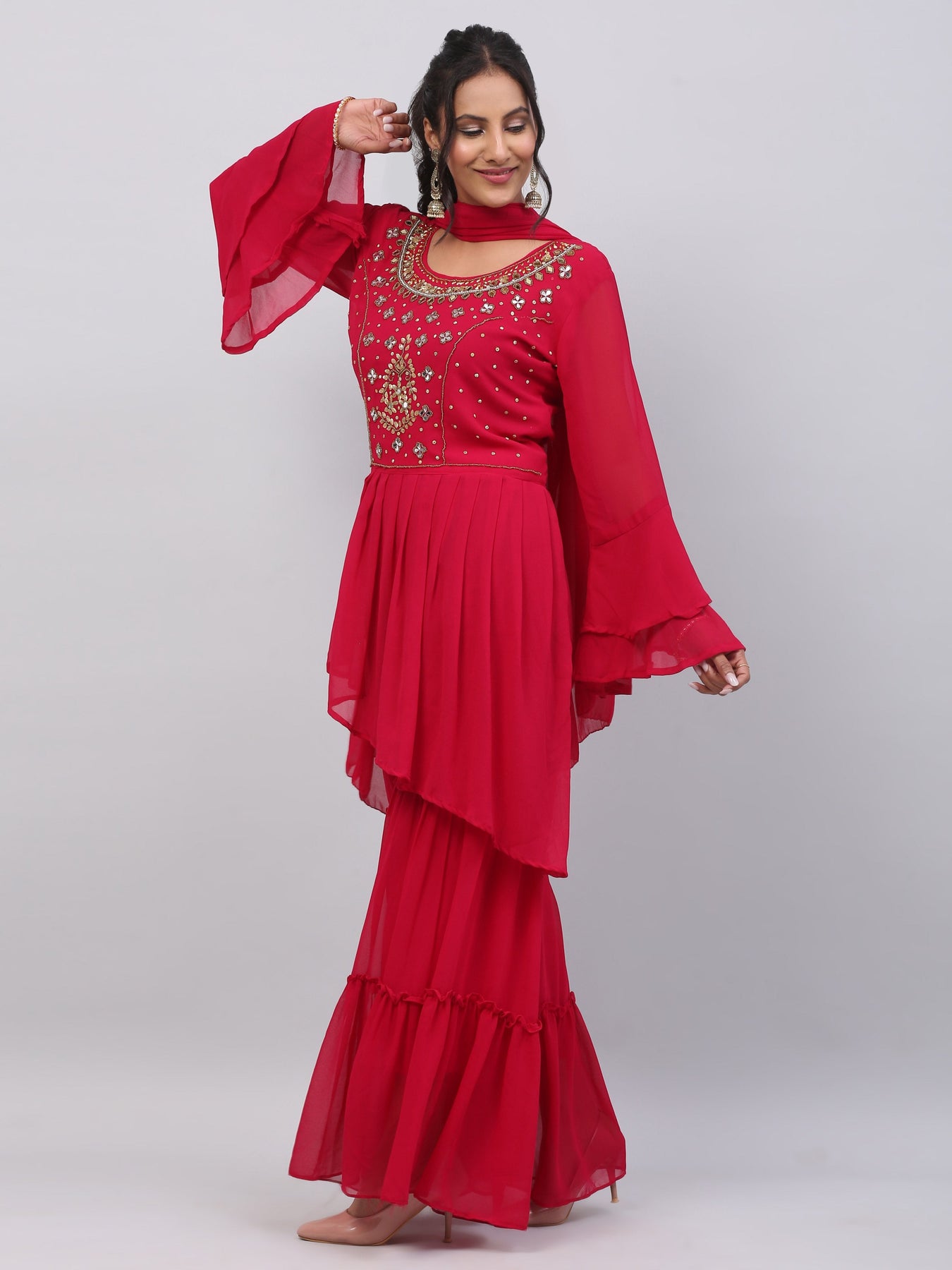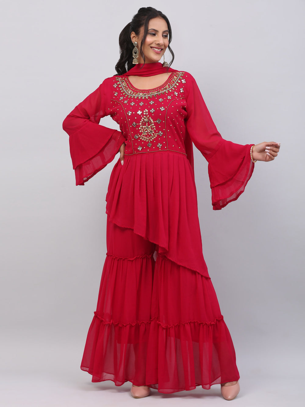 Georgette asymmetrical kurti with beautiful mirrorwork yoke along with layered bell sleeves..