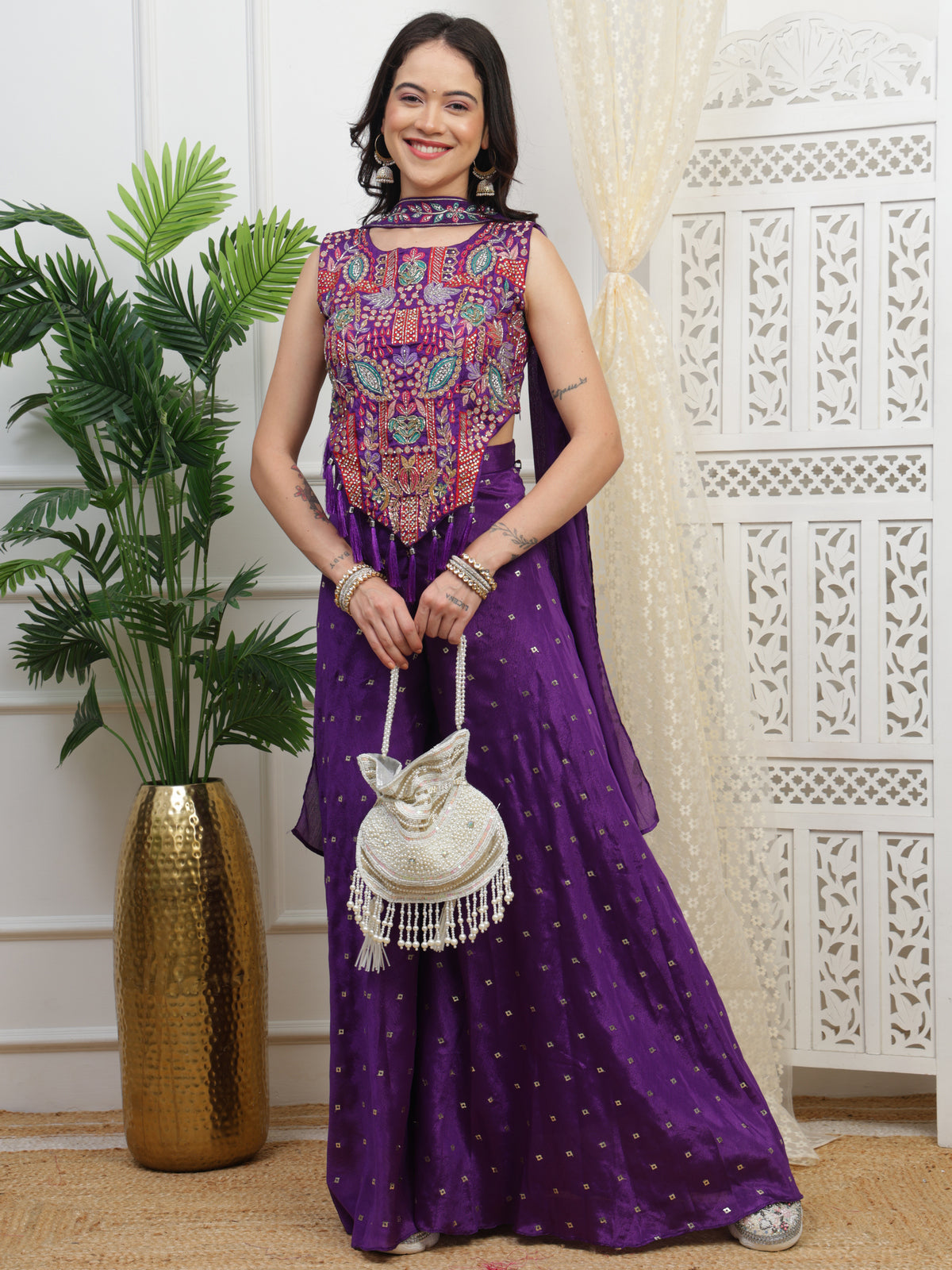 Embroidered Purple High Low top with stunning thread and beadwork gives it a trendy vibe...voluminous flared Palazzo and Choker dupatta makes it an ideal outfit for a semi formal occasion..