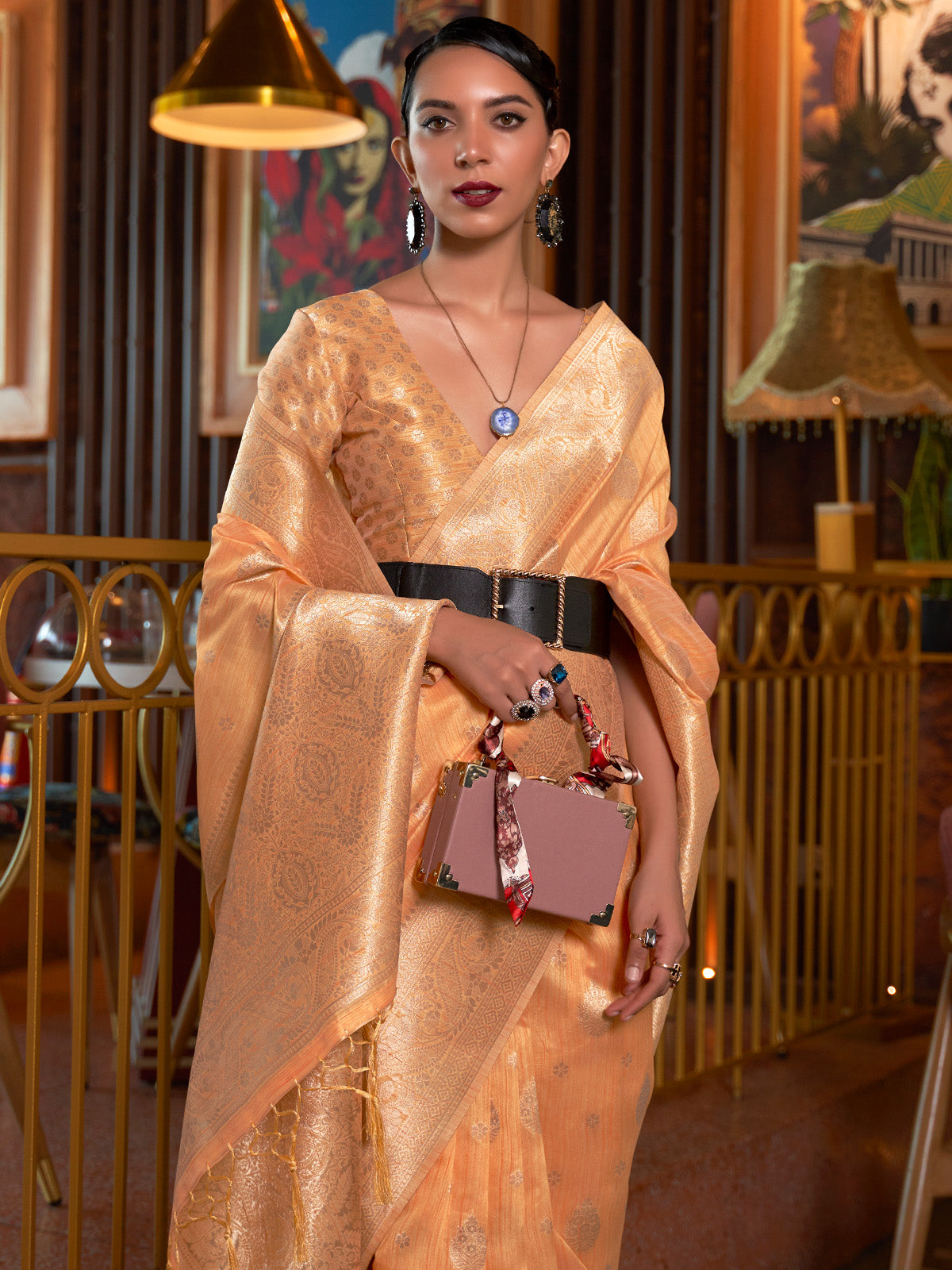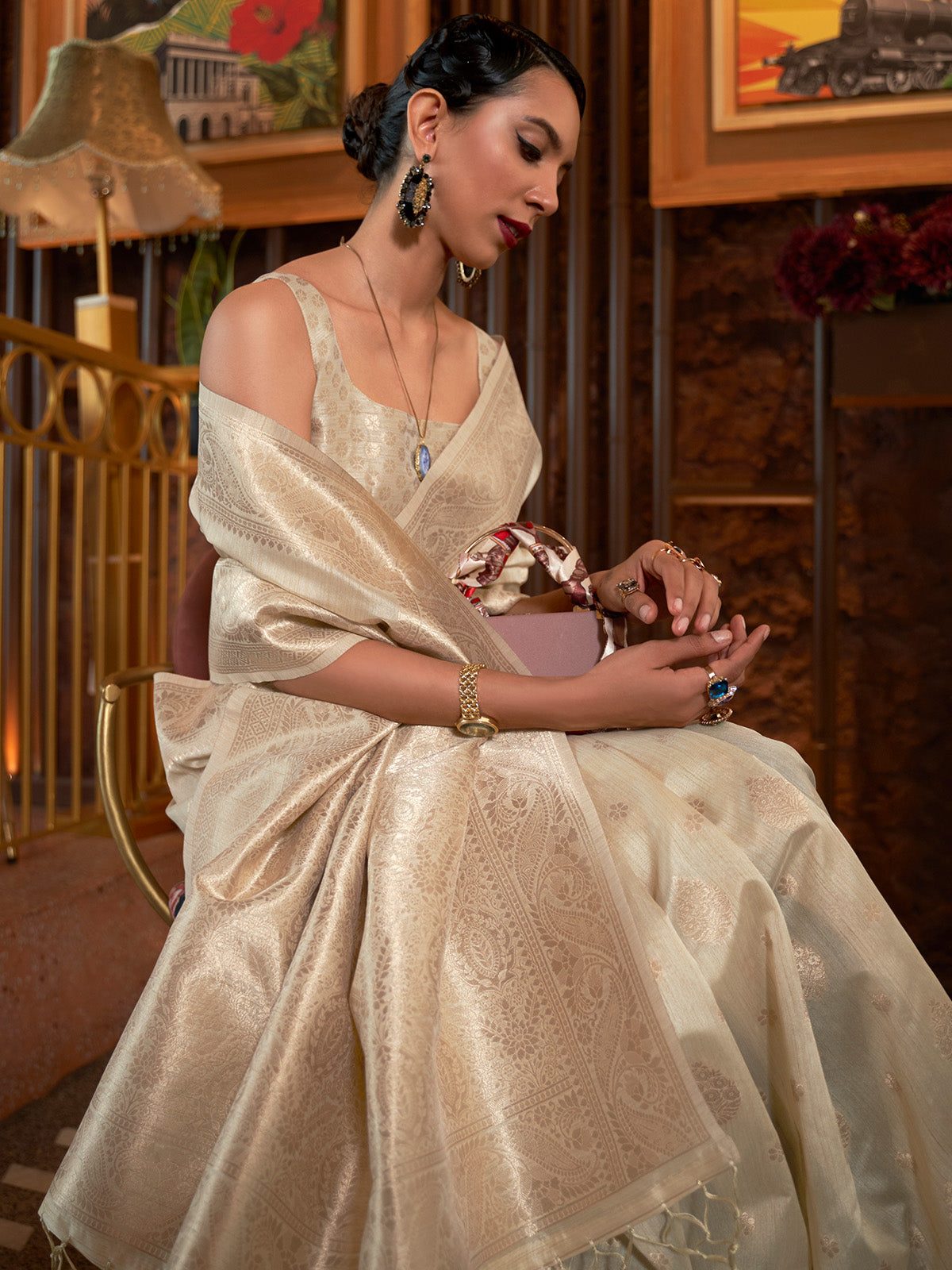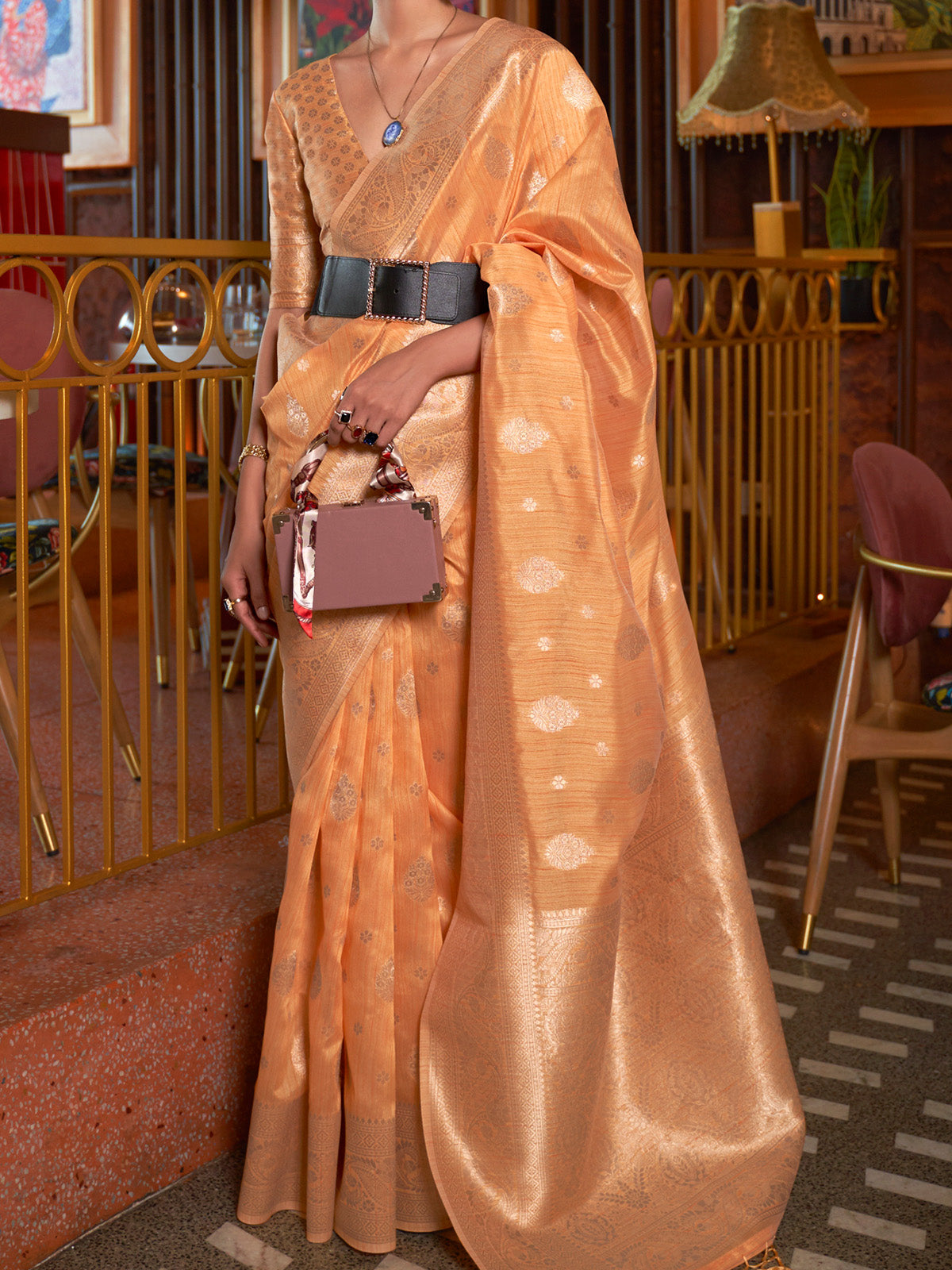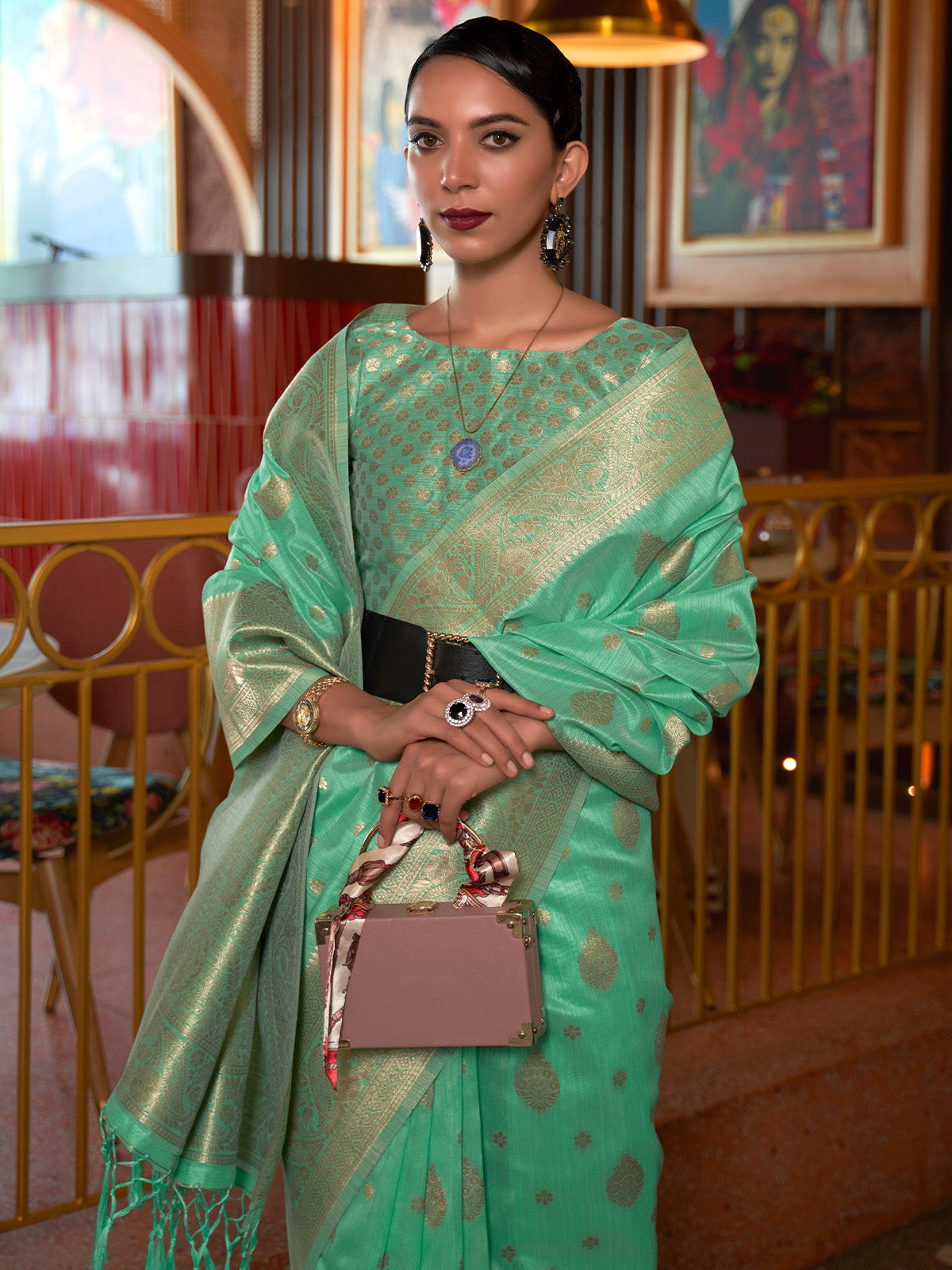 This stunning Handloom Organza Saree is designed with Gold and Silver motifs all over enhanced with Booti blouse piece and Pallu giving it a traditional look.. This Saree showcases the unique and varied Indian craftsmanship..