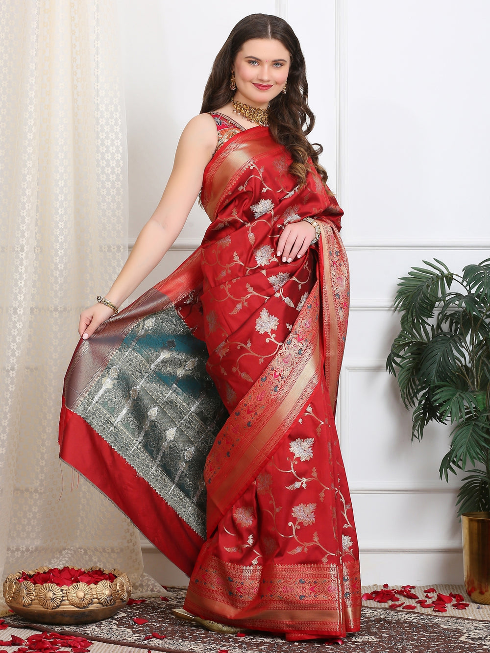 Emerald Red Banarasi Kora Silk Saree
