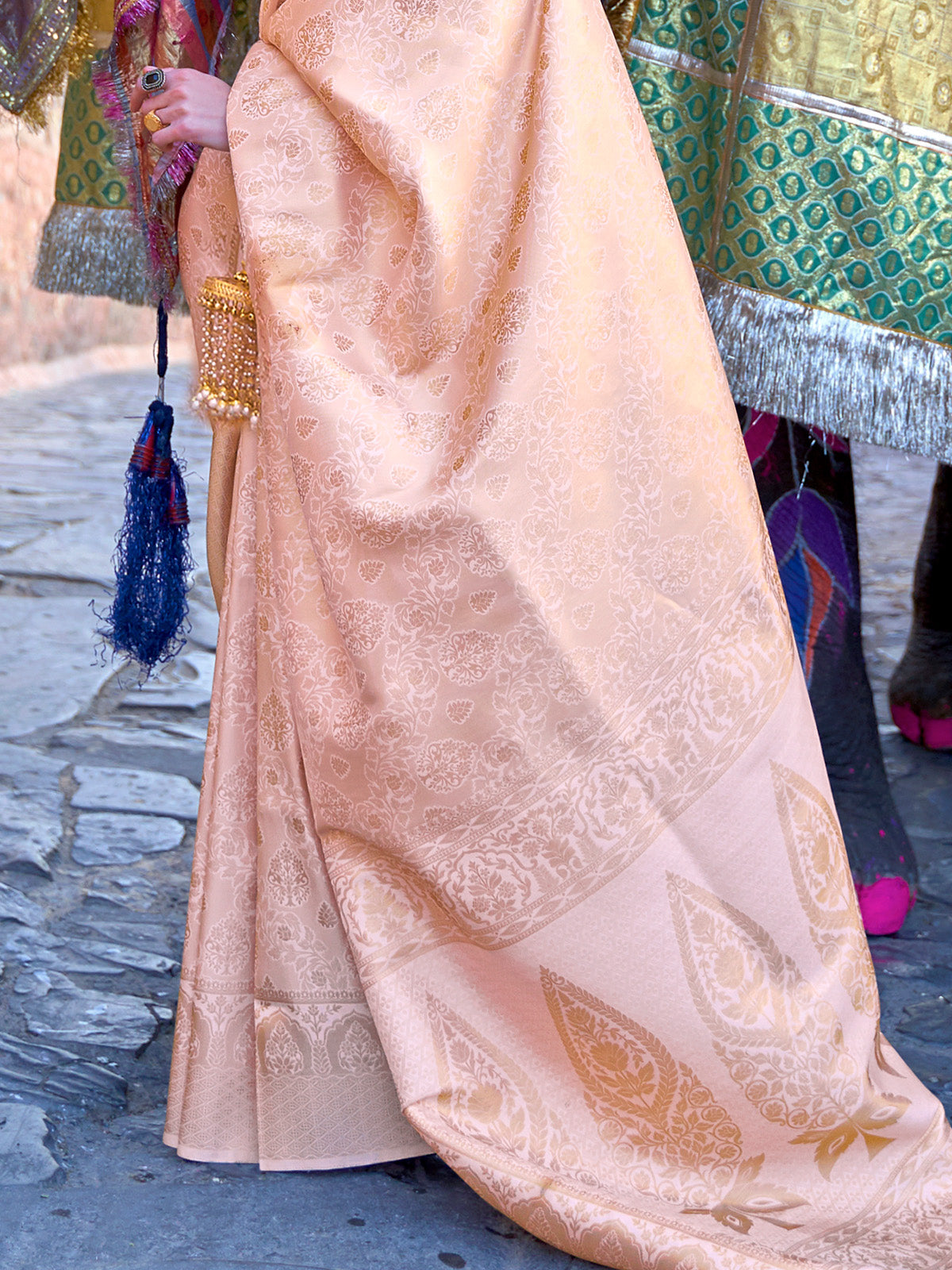 The fabric of this saree creates a rich and luxurious texture in pastel shades...This woven Tanchui displays the traditional pattern woven with a modern touch to give it a timeless appeal...The fabric drapes well and is enhanced by a gorgeous Pallu and blouse piece...