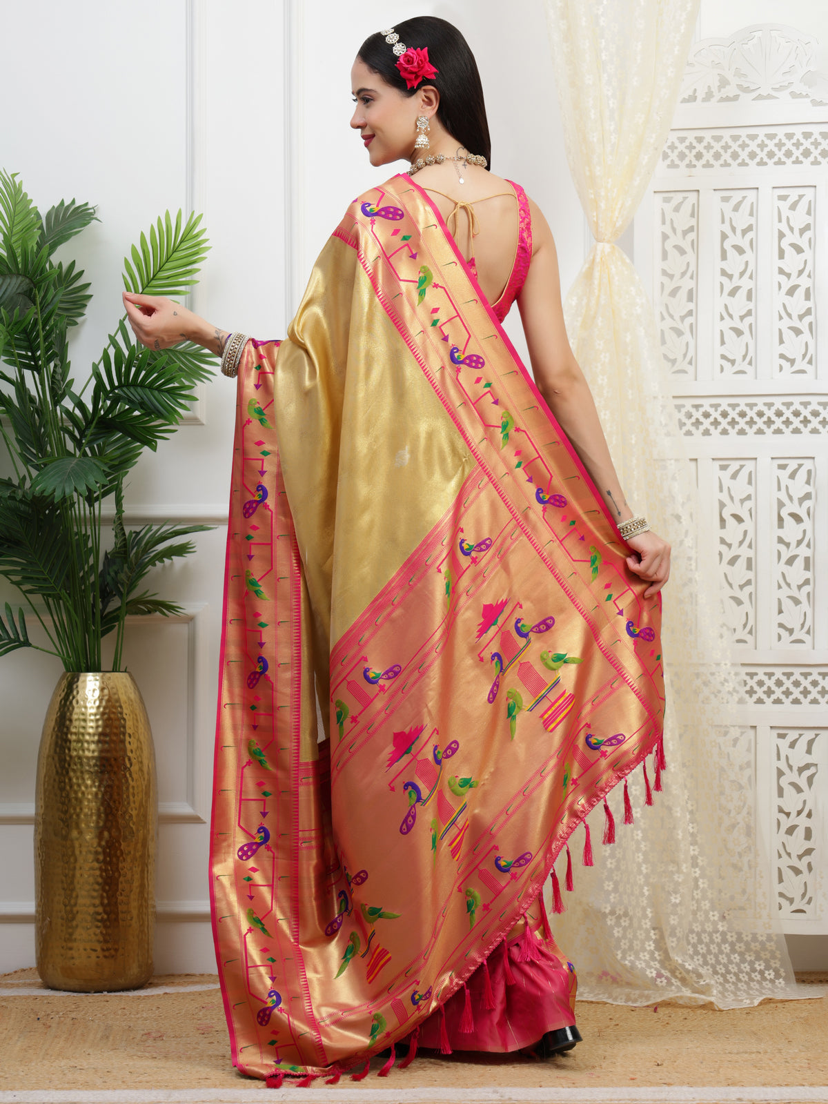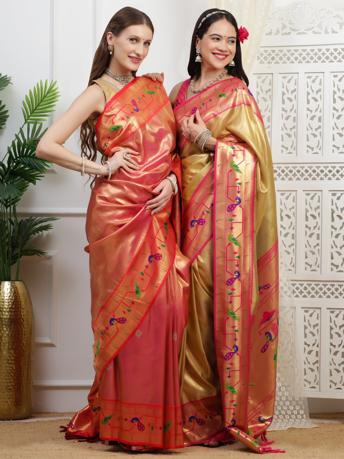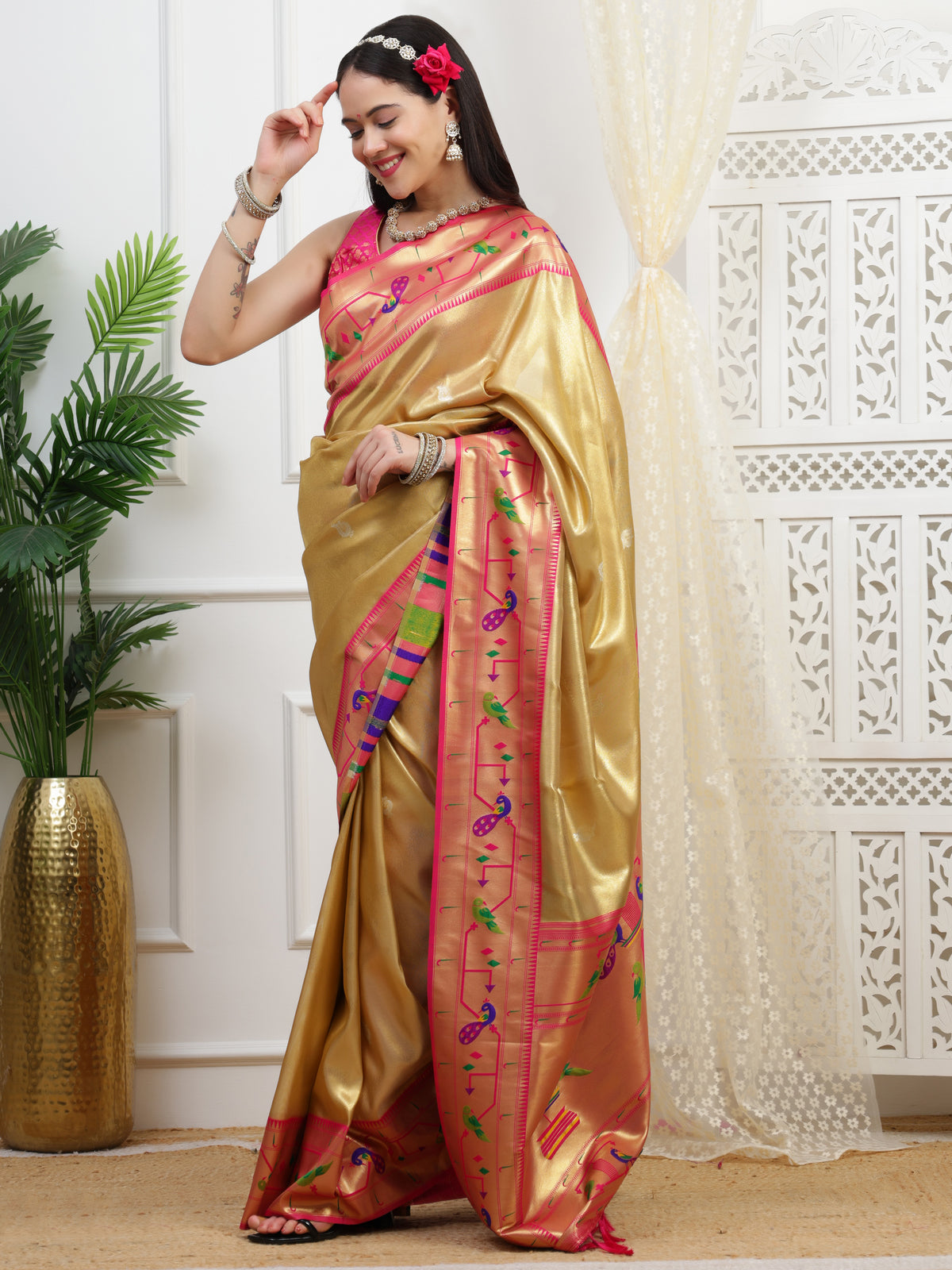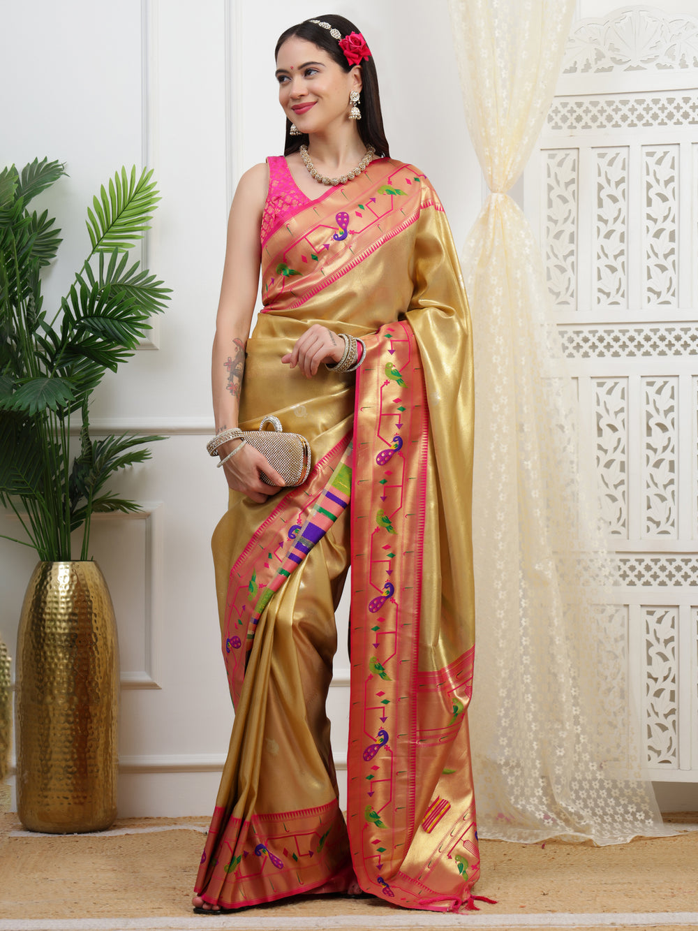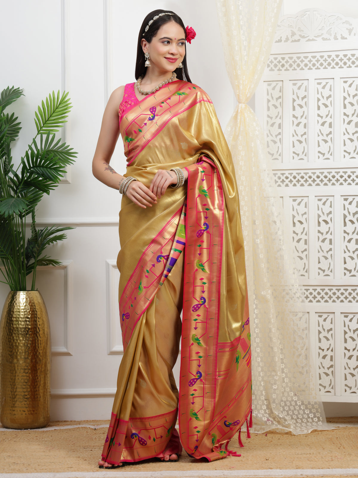 Traditional Paithani Style Saree interwoven with Tissue Zari giving it a rich and luxurious texture...This Saree displays the typical Paithani border and Pallu with a modern touch to give it a timeless appeal...The fabric drapes well and is enhanced by a gorgeous Pallu and blouse piece..