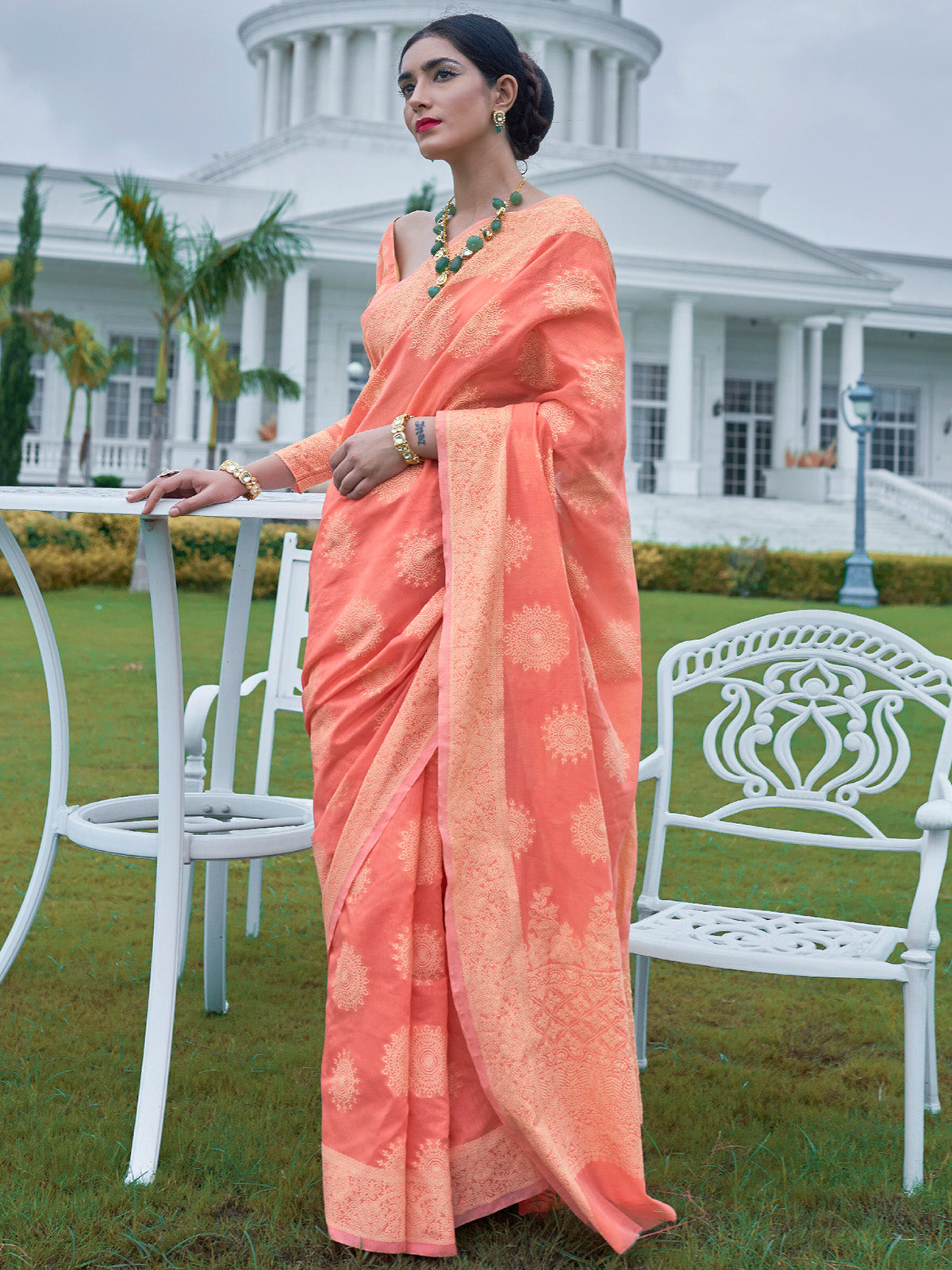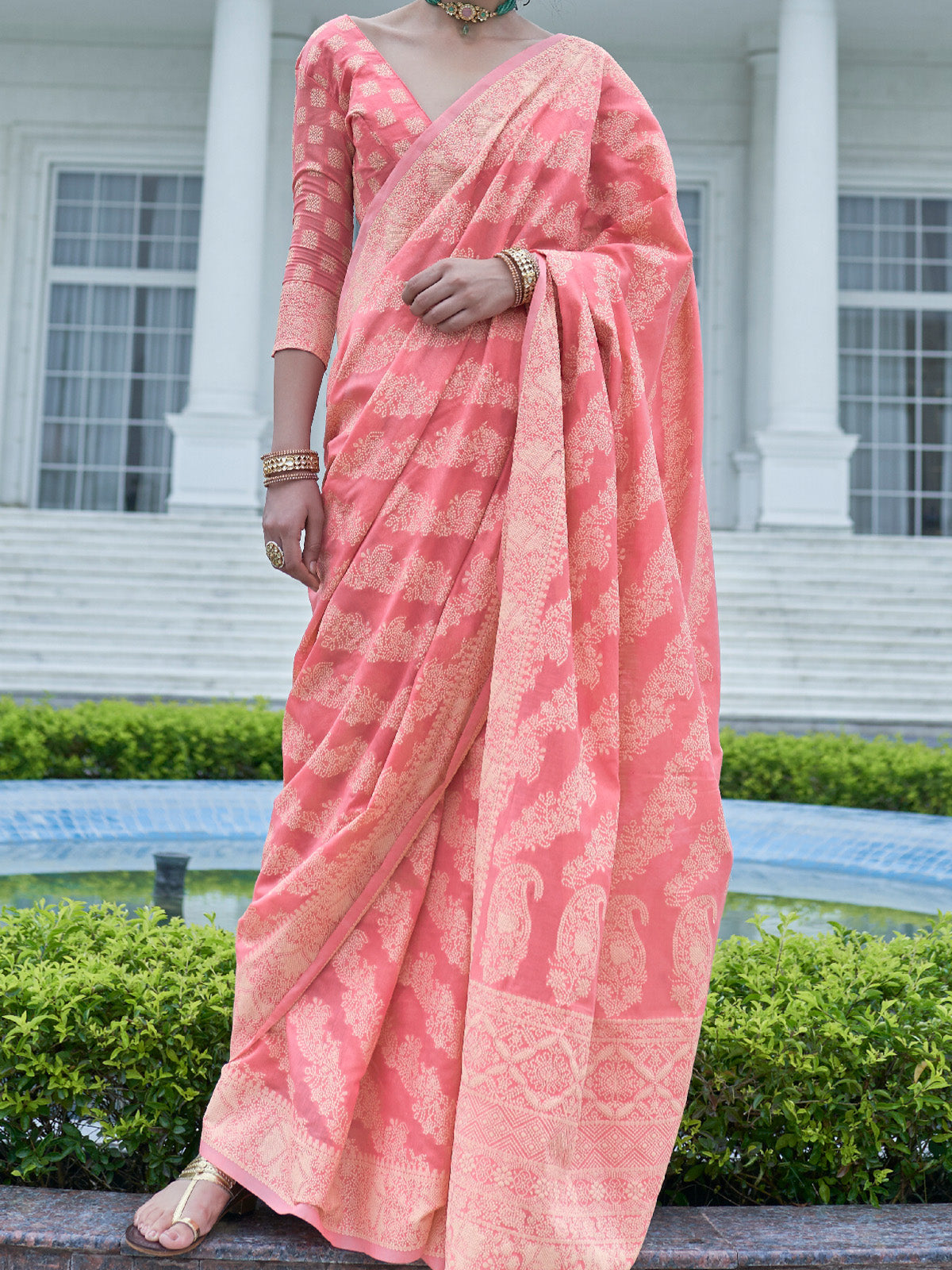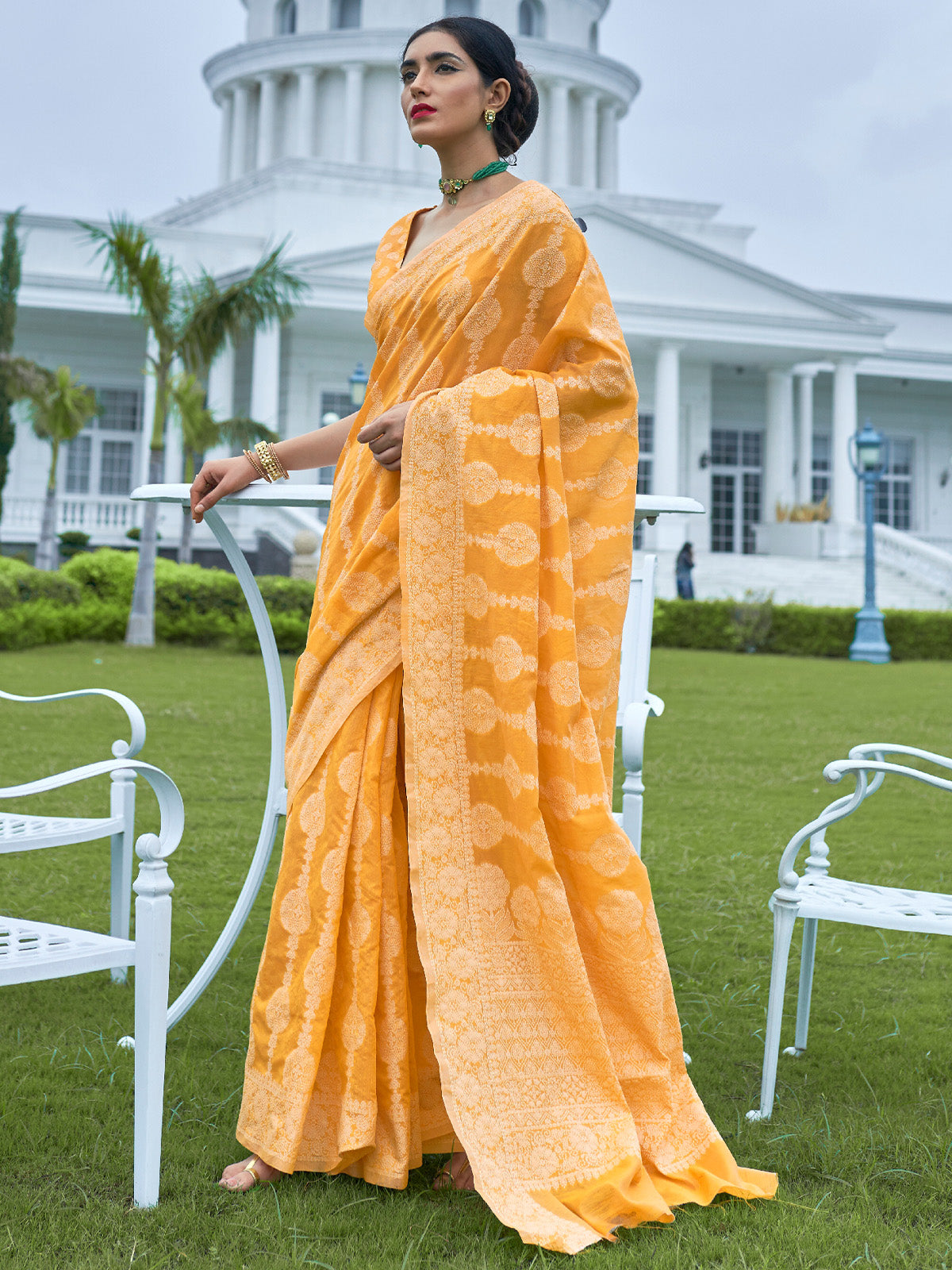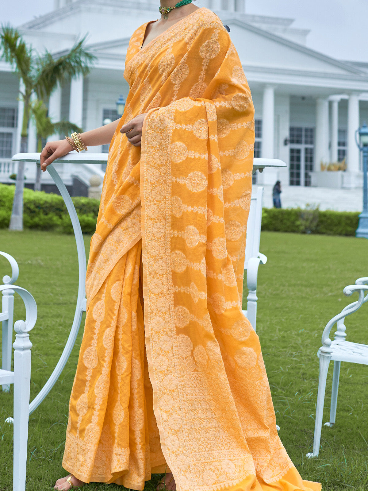 Beautiful Lucknowi woven Handloom Sarees with all over weaving enhanced with gorgeous pallu and blouse piece for that traditional look...The fabric drapes well and displays a stylish and elegant look..