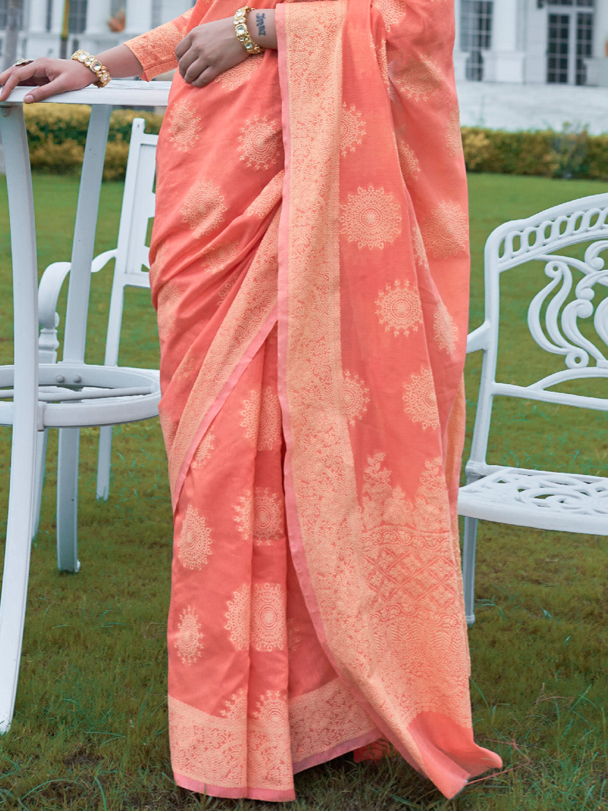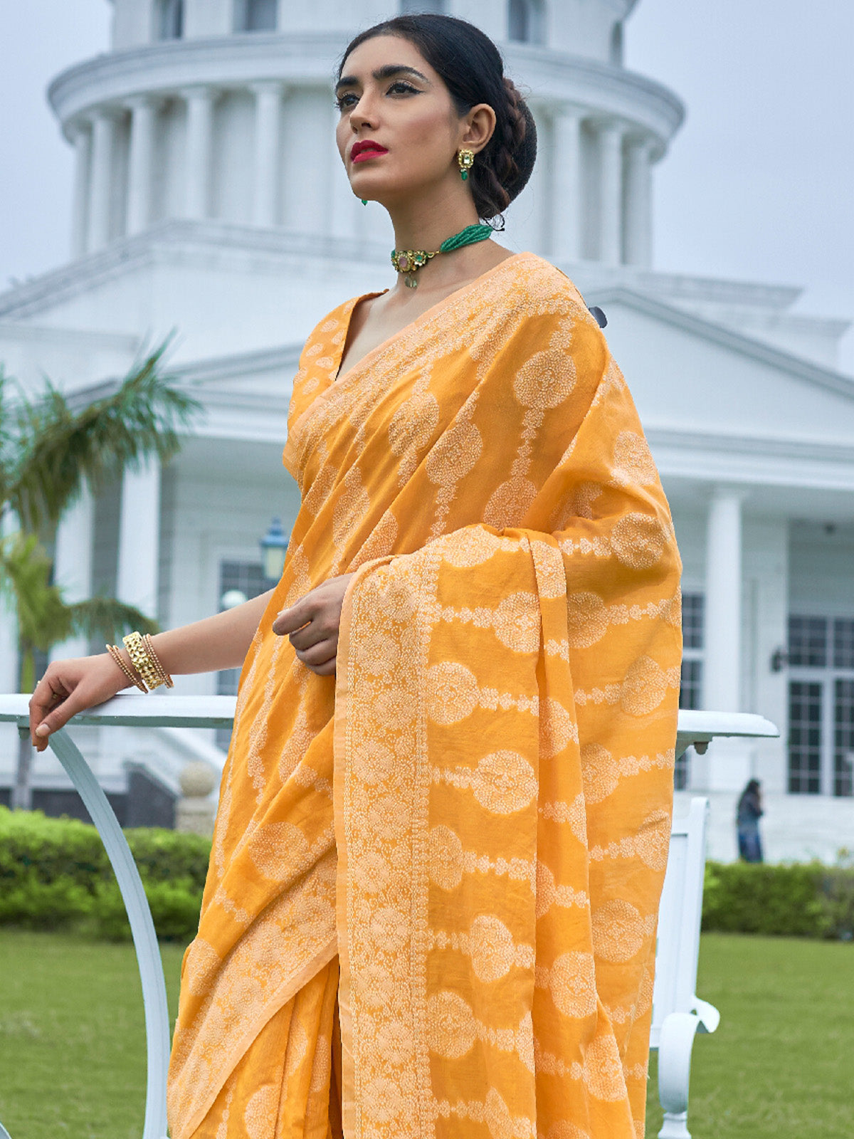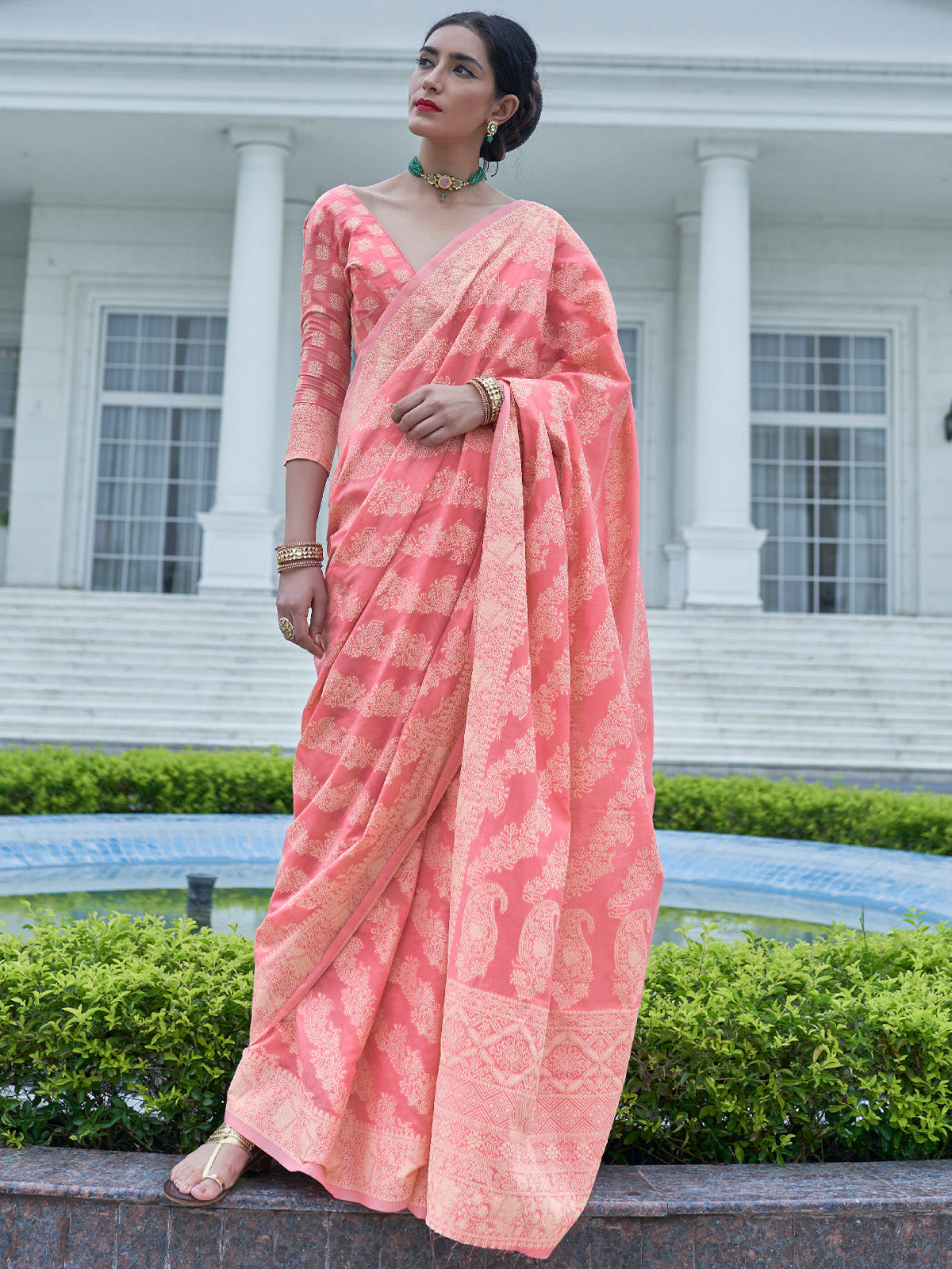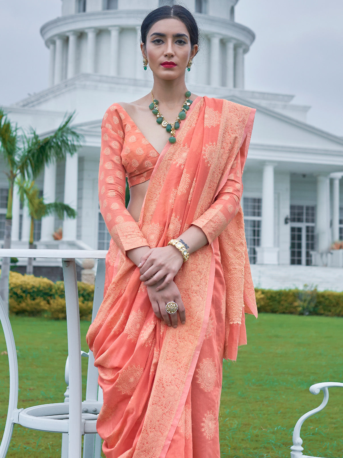 Beautiful Lucknowi woven Handloom Sarees with all over weaving enhanced with gorgeous pallu and blouse piece for that traditional look...The fabric drapes well and displays a stylish and elegant look..