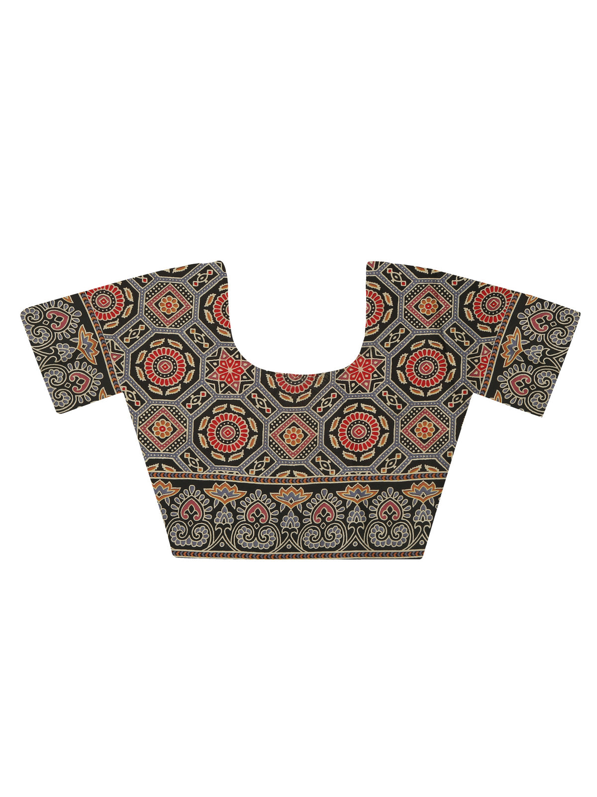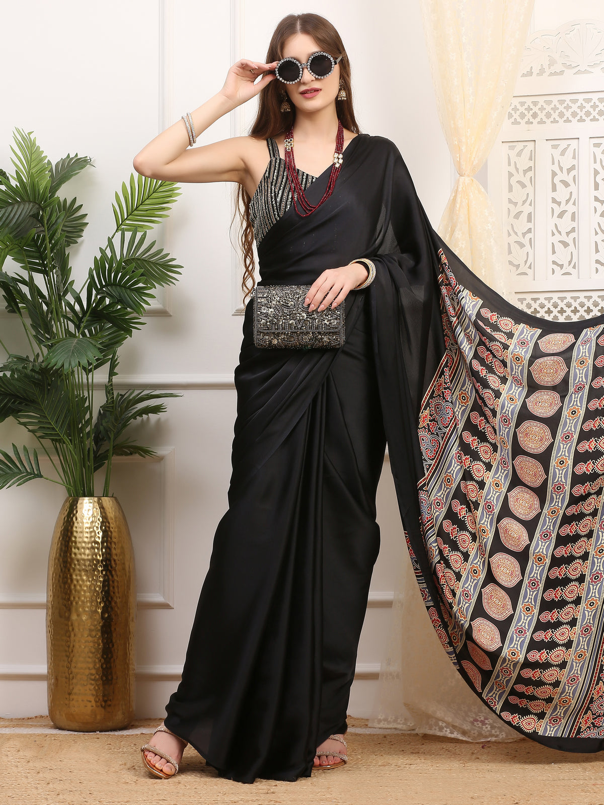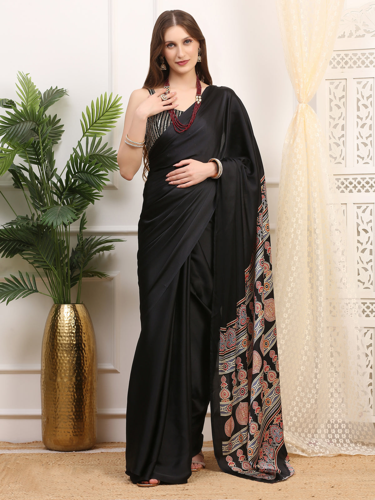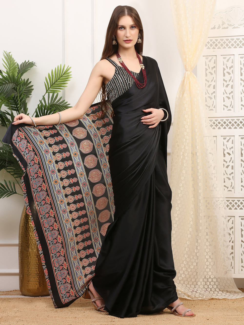 Exquisite Satin Saree with Ajrakh Print on Pallu...Its further enhanced with similar Ajrakh print blouse piece..This stunning Saree is easy to drape and falls well..Can be paired with original blouse piece or can be worn with any contrast blouse to give it a more glamorous look…